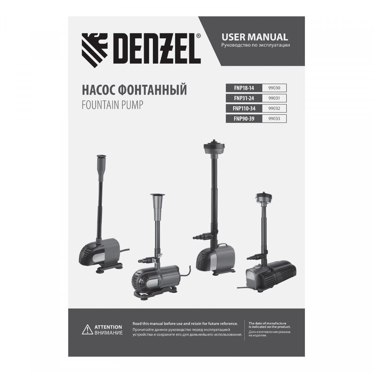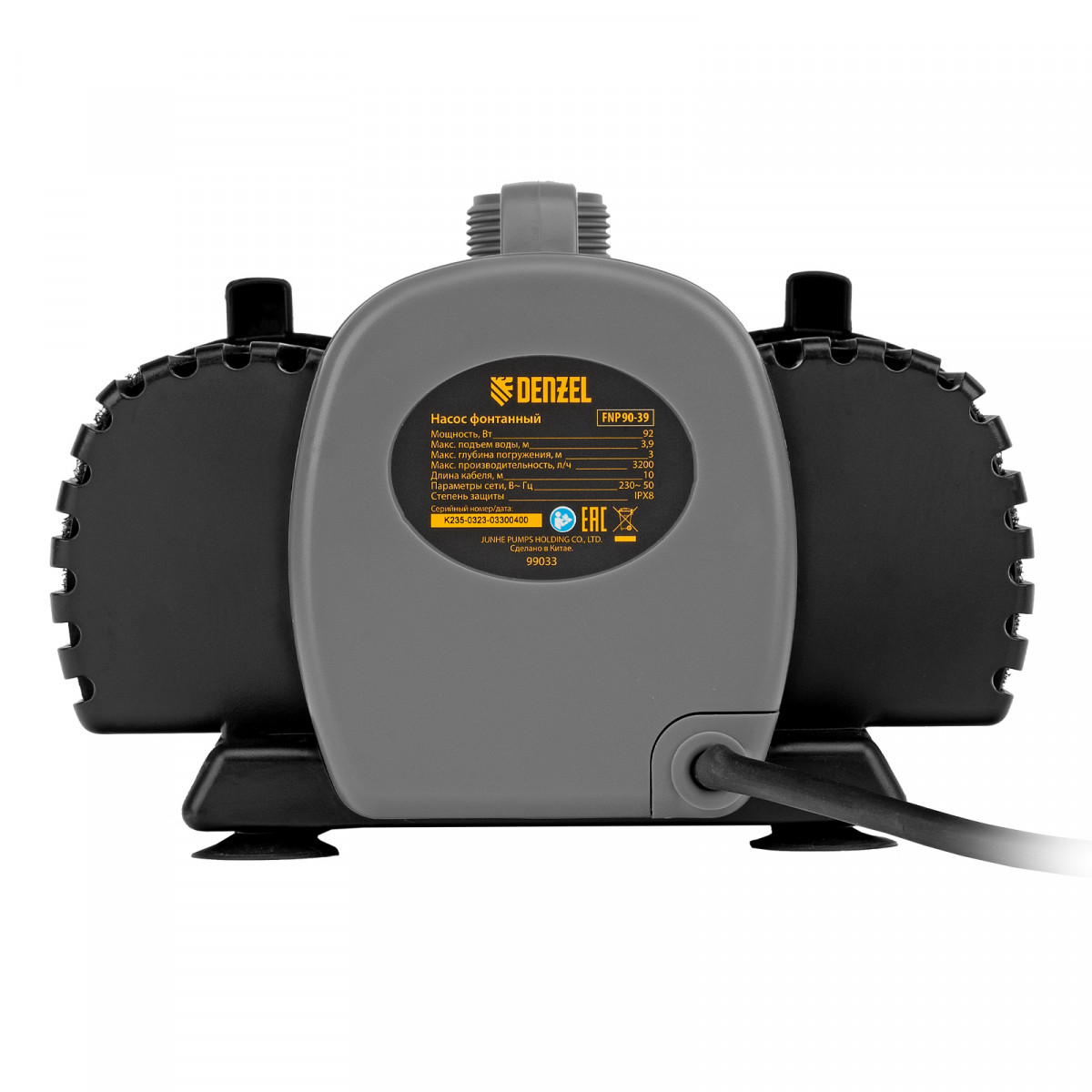 Насос фонтанный FNP90-39, 92 Вт, подъем 3,9 м, 3200 л/ч, колокольчик/каскад/гейзер Denzel