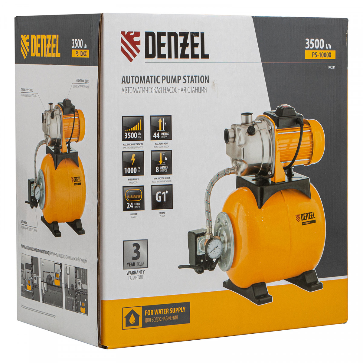Насосная станция PS1000Х, 1000 Вт, 3500 л/ч, ресивер 24 л, подъем 44 м, нержавейка Denzel