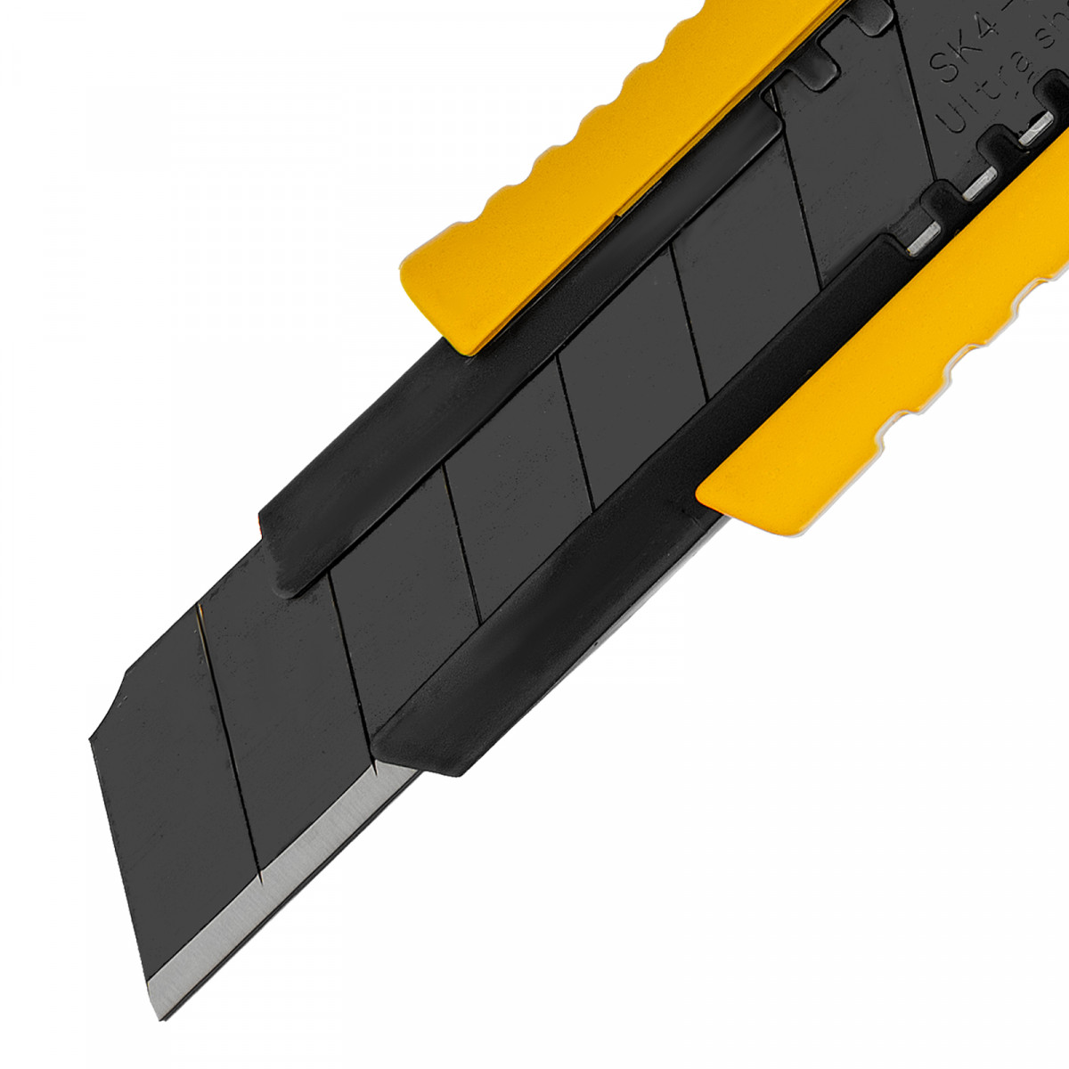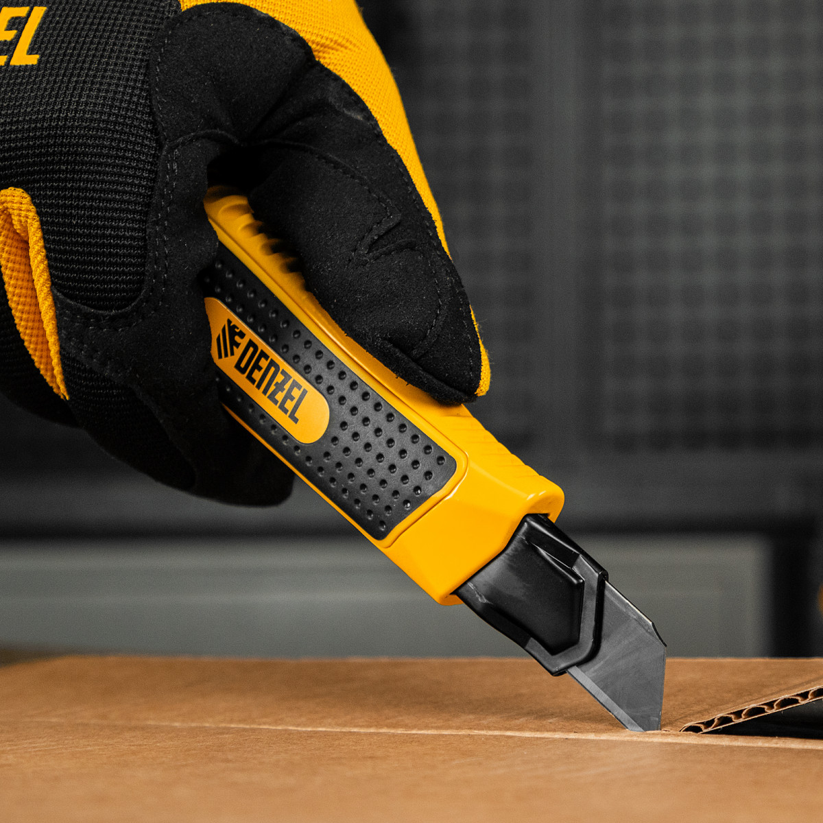 Нож, 18 мм, сменное лезвие, SK4, корпус из цинкового сплава + TPR, торцевой зажим Denzel