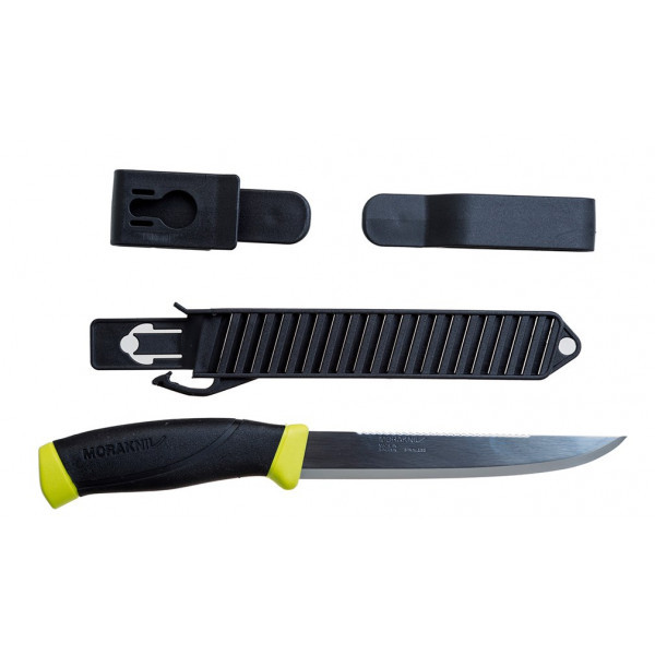 Mora Fishing Comfort Scaler 150 даст фору любому другому ножу во время чистки и разделки рыбы. Его длинное и тонкое лезвие отлично справляется с этой работой. Нержавеющая сталь на клинке требует минимального ухода, что немаловажно в условиях повышенной влажности. Обычная (plain) заточка на ноже работает как скальпель по рыбному филе, в то время как находящийся на обухе ножа серрейтор (зубчатая часть) отлично расправляется с костями, без труда рассекая их. Удобная рукоять имеет прорезиненную вставку, благодаря чему нож отлично контролируется в руке. Легкий вес дает возможность неощутимо носить Mora Fishing Comfort с собой на поясе. Удобные пластиковые ножны надежно удерживают нож, не давая ему случайно выпасть.