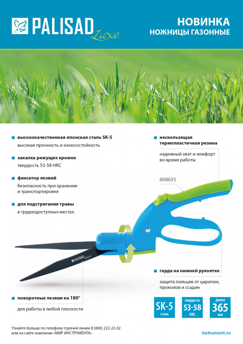 Ножницы газонные Palisad LUXE 608635 длиной 365 мм, с пластиковыми обрезиненными рукоятками, — инструмент для подстригания травы вдоль кромок газонов, дорожек, бордюров, ограждений, а также возле кустов. Поворотные на 180° лезвия облегчают работу в труднодоступных местах. Гарда на нижней рукоятке защищает пальцы от царапин, проколов и ссадин. Механизм автооткрывания препятствует заеданию лезвий при стрижке жесткой травы. Ножницы помогут привести в порядок дачный участок или придомовую территорию.