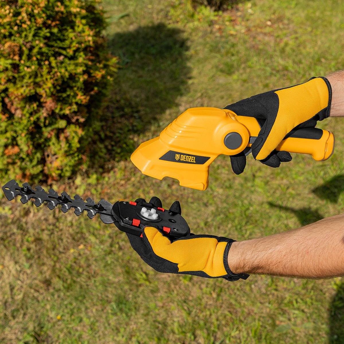 Аккумуляторные ножницы-кусторез Denzel G411 968177 с Li-Ion батареей напряжением 3,6 В и емкостью 1,5 Ач предназначены для поддержания декоративной растительности на дачном участке в аккуратном виде. В комплект входят две оснастки: для подрезания газонной травы и для обрезки кустов и тонких веток деревьев. Благодаря простому управлению и малому весу 0,6 кг с ножницами-кусторезами легко справятся даже пожилые люди.