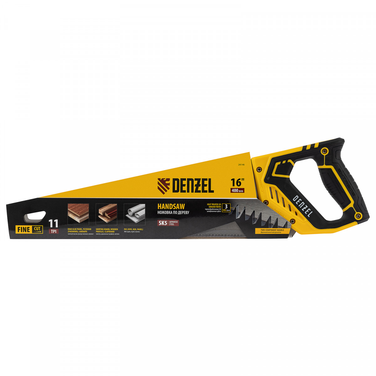 Ножовка по дереву Denzel 24146 длиной 400 мм, с зубьями с шагом 11 TPI и 3D-заточкой, с двухкомпонентной рукояткой, предназначена для продольной и поперечной распиловки заготовок из древесины, ДСП, ДВП, МДФ, ламината, а также из ПВХ (труб, панелей, коробов). Подходит для распиливания плинтусов, вагонки, деревянных профиле й. Мелкие зубья с шагом 11 TPI позволяют выполнять точный и чистый рез. Ножовка используется для проведения столярных работ в мастерской и на дачном участке.