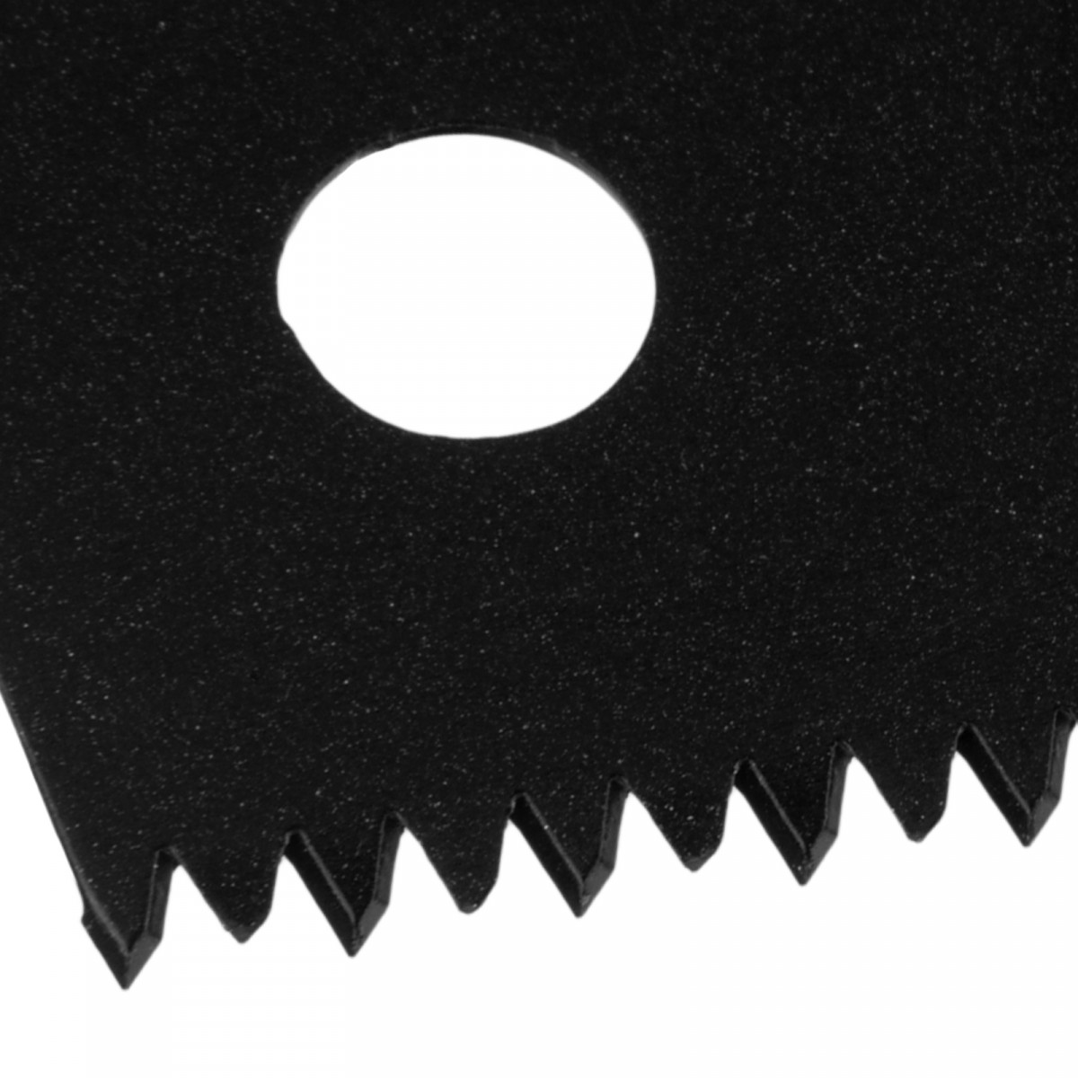 - Высокий ресурс — закаленные зубья твердостью 50-55 HRC долго держат заточку, тефлоновое покрытие защищает полотно от коррозии.