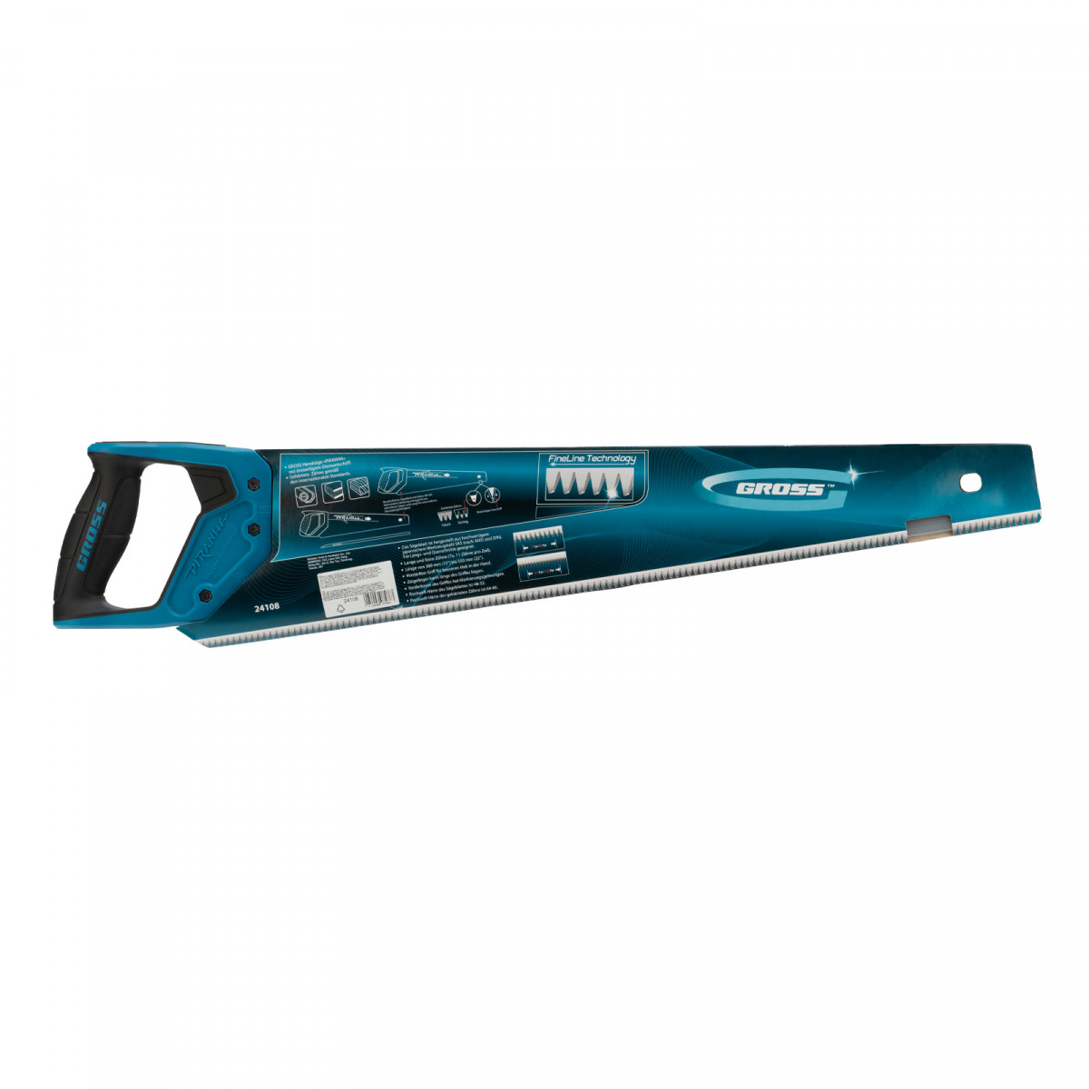 Ножовка по дереву Gross PIRANHA 24108 с полотном длиной 550 мм, калеными зубьями с 3D-заточкой и шагом 11-12 TPI, с тефлоновым покрытием полотна и 2-компонентной рукояткой, используется для продольного и поперечного распиливания древесины различных пород, МДФ, ДСП, ДВП, ламината, а также пенополистирола, полиуретана и других синтетических материалов. Рабочая часть состоит из мелких зубьев с шагом 2-2,3 мм, что позволяет получить ровный и чистый рез. Трехгранная заточка зубьев увеличивает производительность инструмента без потери качества распиловки. Ножовка предназначена для столярных работ.