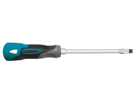 Отвертка GROSS SL5.5x100 мм 12110 предназначена для работы с резьбовыми соединениями, имеющими плоский шлиц. Максимальный крутящий момент затяжки достигает 5.5 Нм. Стержень изготовлен из прочной инструментальной стали S2 и имеет хромовое покрытие для защиты от коррозии. Благодаря насечкам на жале увеличивается трение между отверткой и шлицом крепежа, что препятствует его повреждению. Удобная форма трехкомпонентной рукоятки обеспечивает надежный хват. |