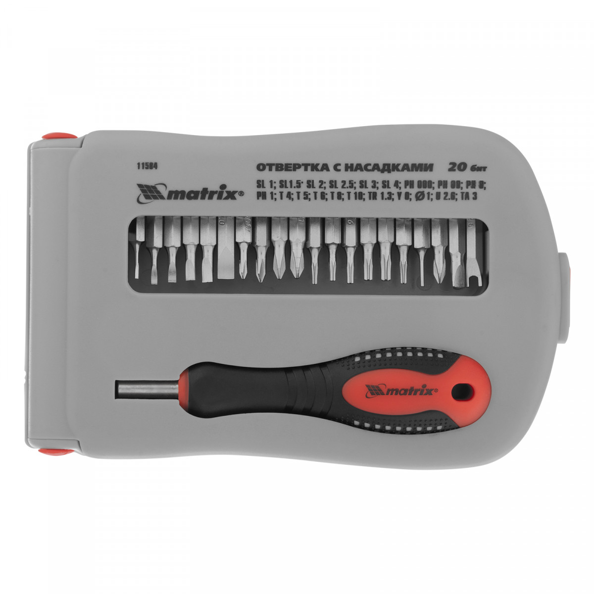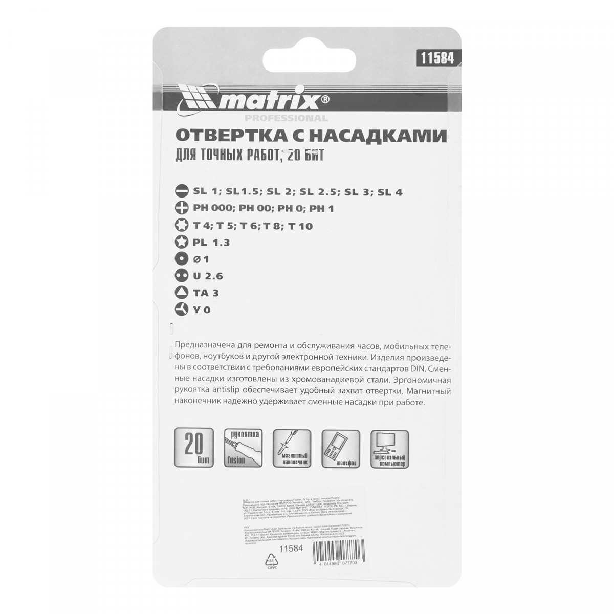 Отвертка для точных работ Matrix Fusion 11584 с с насадками, — это набор из 22 предметов в пластиковом пенале, который используется для ремонта электротехники, очков, мобильных телефонов, ноутбуков и т.д. 20 бит для точных работ и битодержатель обеспечивают эффективное решение поставленных задач. Набор пригодится профессиональному мастеру.