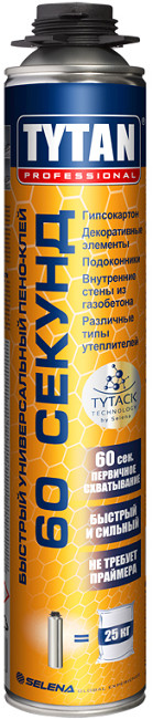 TYTAN 60 Секунд представляет собой многоцелевой пено-клей с высокой адгезией ко многим материалам и основаниям. Уникальная формула на основе TYTACK технологии дает быстрое начальное схватывание после 60 секунд без расширения, что обеспечивает стабильность склеиваемых элементов и предотвращает их деформацию.