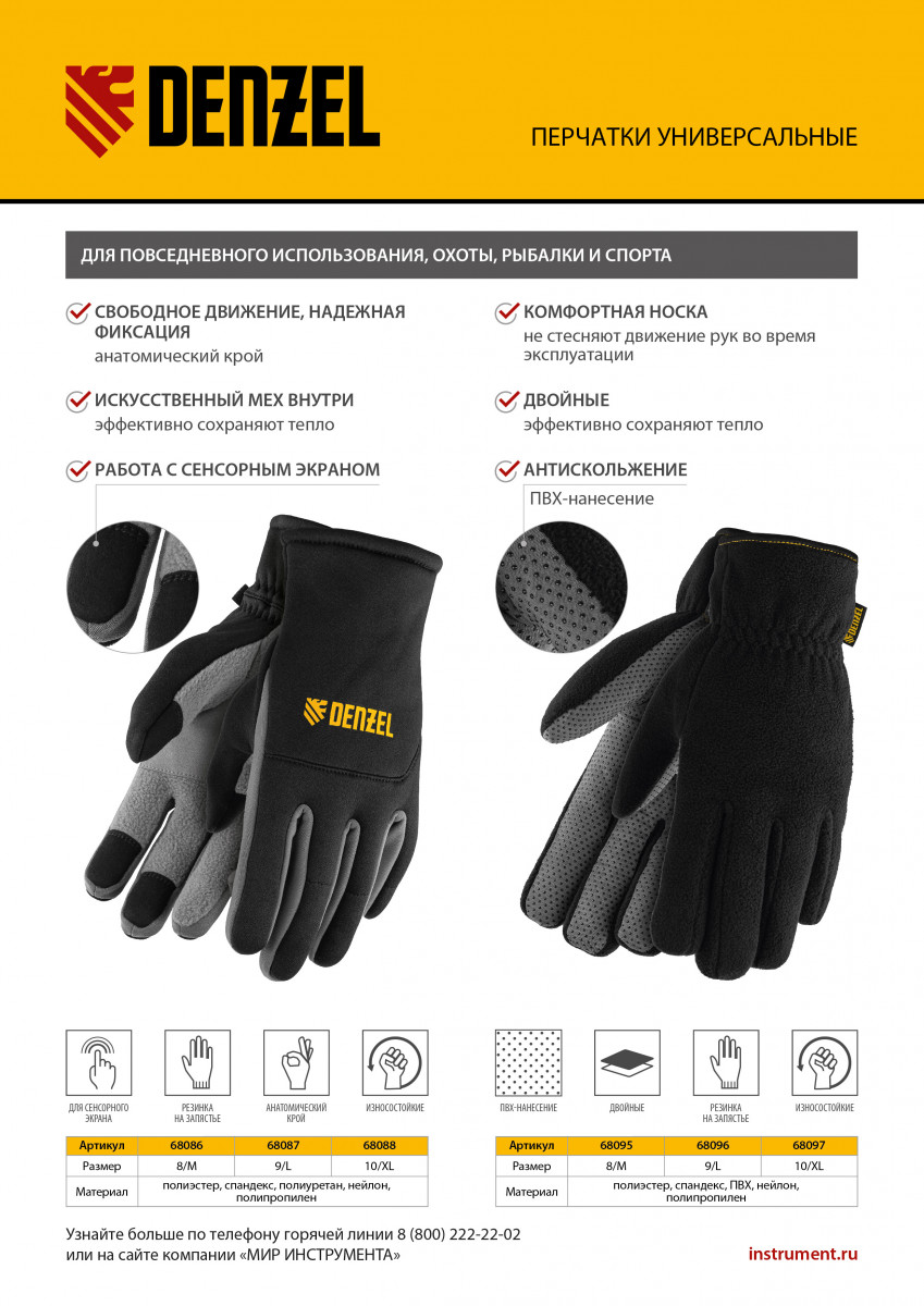 Универсальные перчатки Denzel 68088 размера 10, c искусственным мехом, предназначены для повседневного использования, а также будут полезны на охоте, рыбалке, во время занятий спортом. Подходят для работы с сенсорным экраном: специальные накладки на указательном и среднем пальцах позволяют пользоваться смартфоном, не снимая перчаток.
