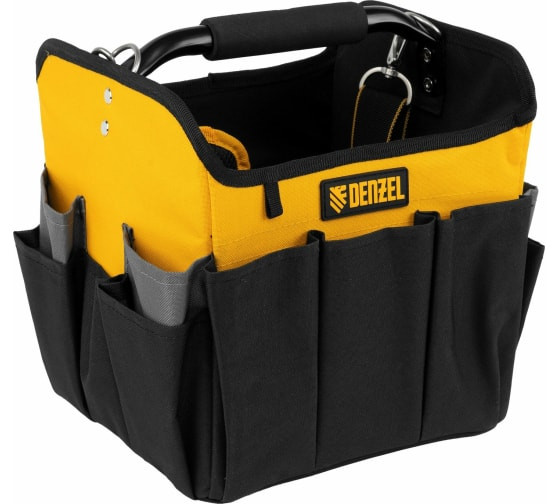 Переноска для инструмента Denzel 260x240x300 мм, 22 кармана, наплечный ремень 90294 предназначена для транспортировки и хранения ручного инструмента. Множество внешних и внутренних карманов удобны для быстрого доступа к нужному инструменту, а также позволяют оптимизировать пространство переноски. Переноска оснащена стальной рукояткой с неопреновой круглой накладкой, а также плечевым ремнем с возможностью регулировки длины (широкая подвижная накладка для удобства). Данная модель удобна, как при выездных работах, так и для хранения инструмента, например, дома, в машине, на даче или в гараже. Материал переноски - плотный полиэстер (600 D), устойчивый к истиранию. Конструкция сумки усилена боковым каркасом. На дне сумки с внешней стороны установлены пять пластиковых сферических подставок. В случае необходимости, стальные карабины на плечевом ремне позволяют быстро отсоединять его от переноски. Длина плечевого ремня 1350 мм.