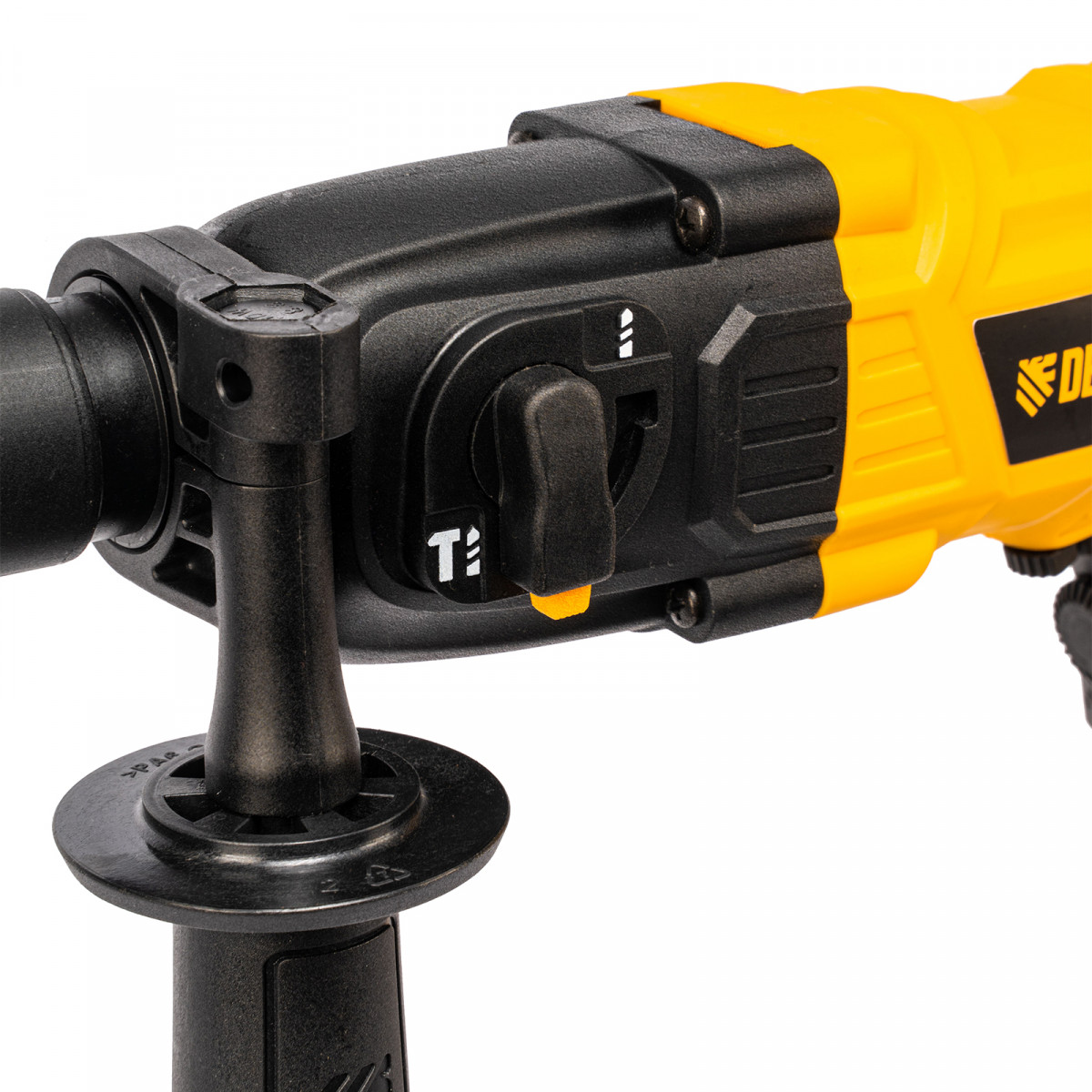 Электрический перфоратор Denzel RH-400-12 26601 мощностью 400 Вт, с патроном под хвостовик SDS-plus, с 2 режимами, развивает энергию удара 1,2 Дж и используется для проведения отделочных и монтажных работ. Эффективно работает с твердыми материалами. Максимальный диаметр отверстий в бетоне составляет 12 мм, в древесине — 20 мм, металле — 13 мм. Является альтернативой ударной дрели: такой же компактный, но благодаря вакуумно-компрессионному механизму не требует дополнительных усилий для сверления и бурения даже бетонных и кирпичных конструкций.