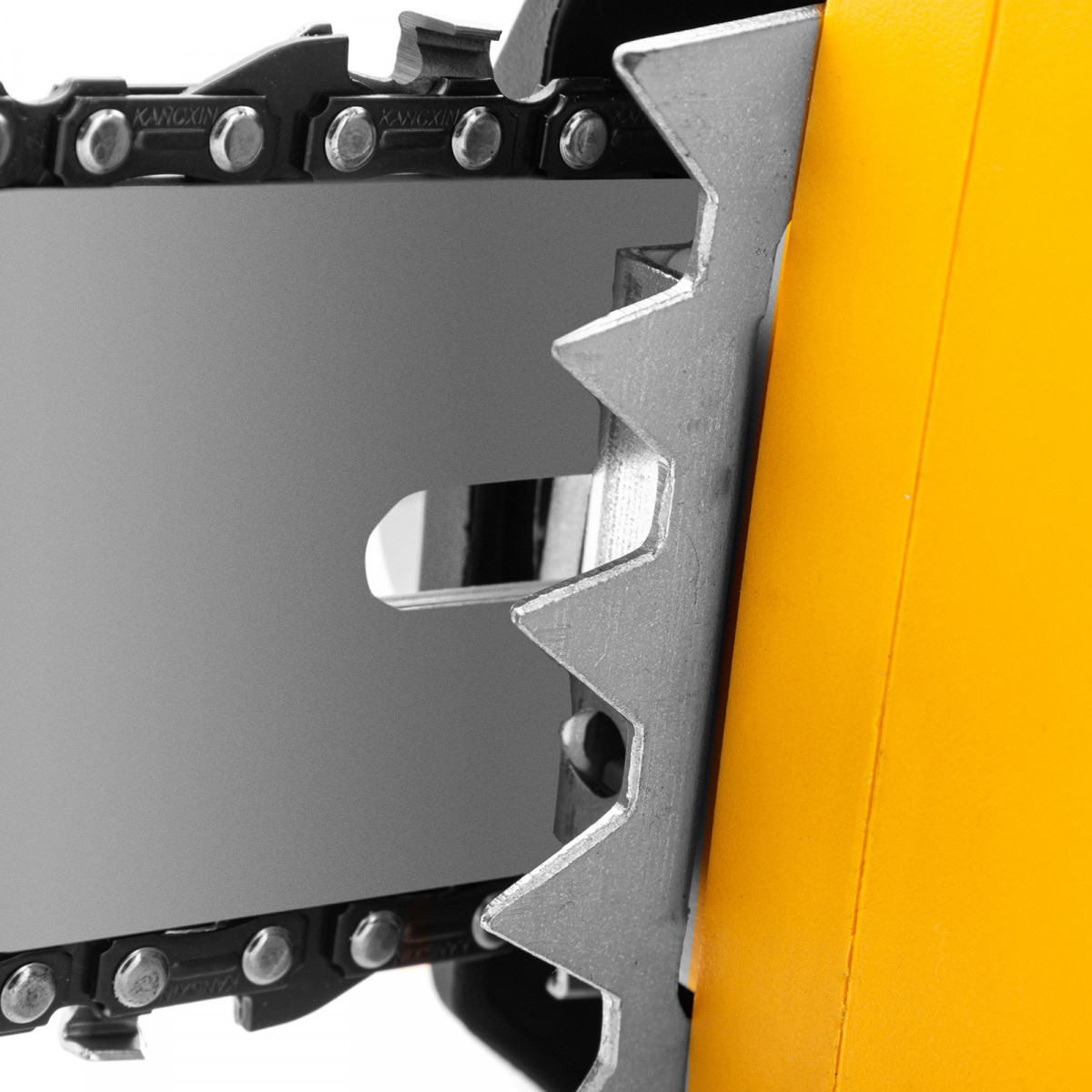 - Удобное использование — зубчатый упор не соскальзывает с древесины, надежно фиксируя пилу и уменьшая нагрузку на руки пользователя, что особенно удобно для работы с крупными бревнами или деревьями.
