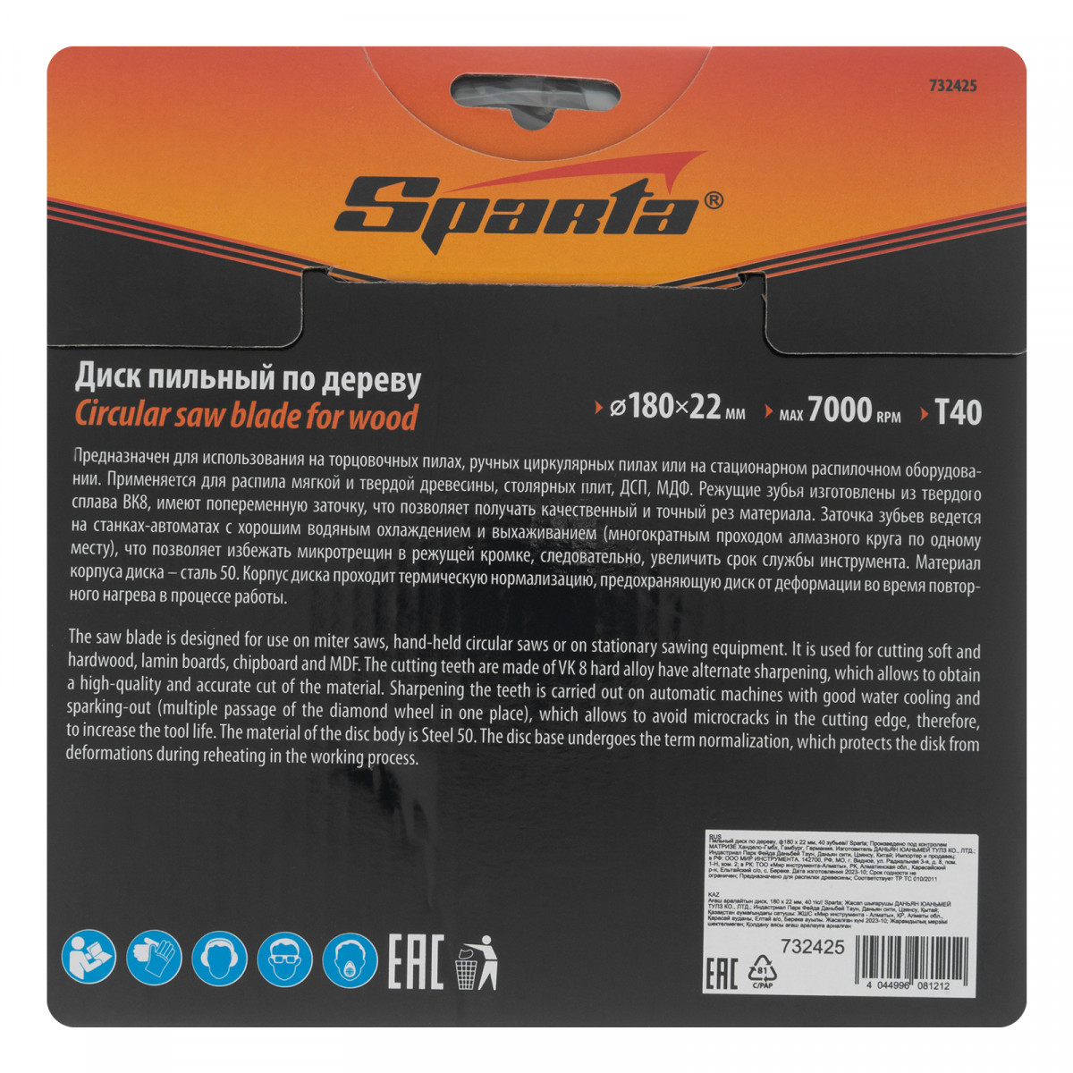 Пильный диск по дереву, 180 х 22 мм, 40 зубьев Sparta