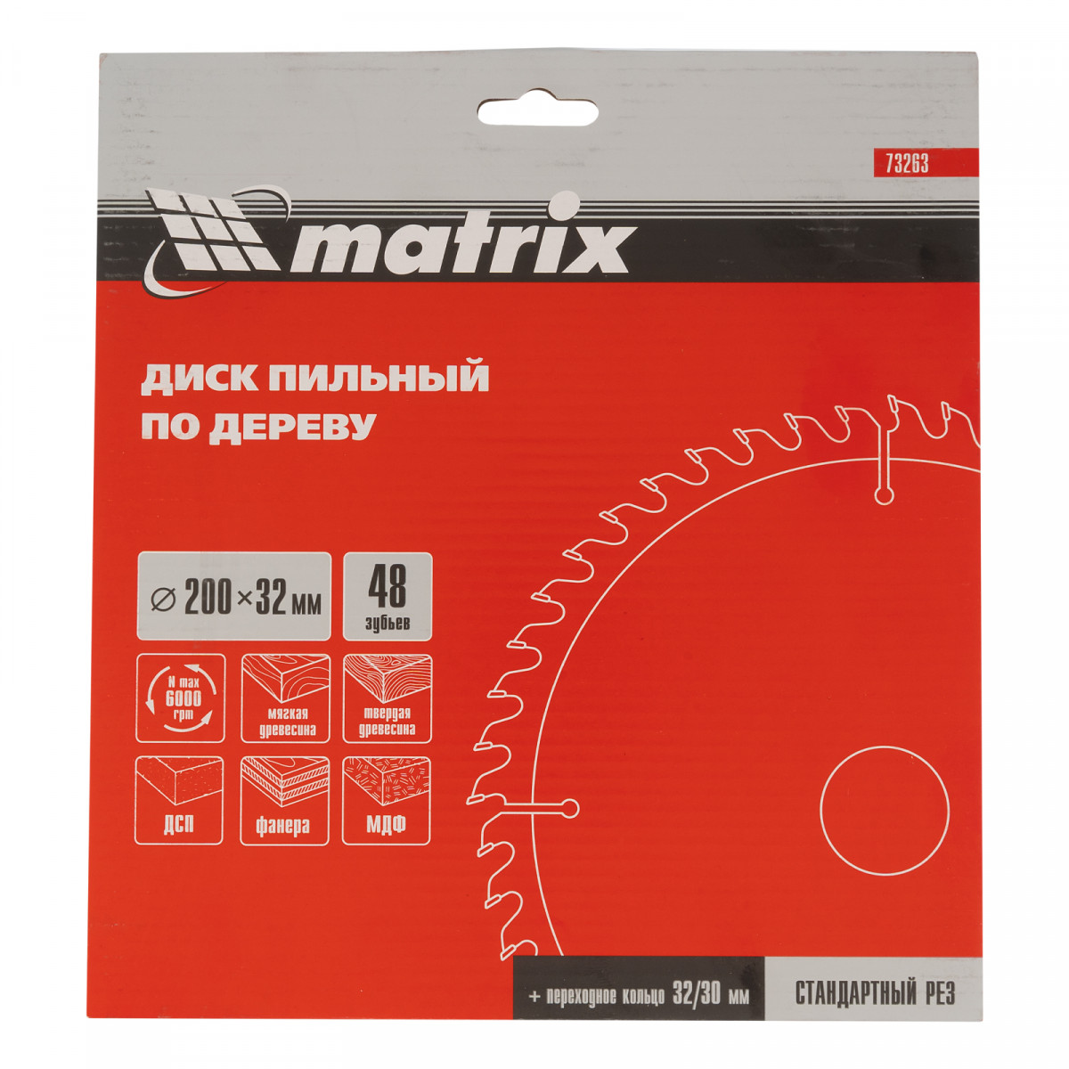 Пильный диск по дереву Matrix 73263 диаметром 200 х 32 мм, с 48 зубьями и переходным кольцом 32/30, — оснастка для циркулярных и торцовочных пил с соответствующим посадочным и внешним диаметром. Используется преимущественно для поперечного реза материалов из мягкой и твердой древесины, ДСП, ДВП, фанеры, столярных плит. В комплект поставки входит переходное кольцо 32/30, позволяющее самостоятельно изменить посадочный диаметр при необходимости. Диск подходит для бытового и профессионального применения.