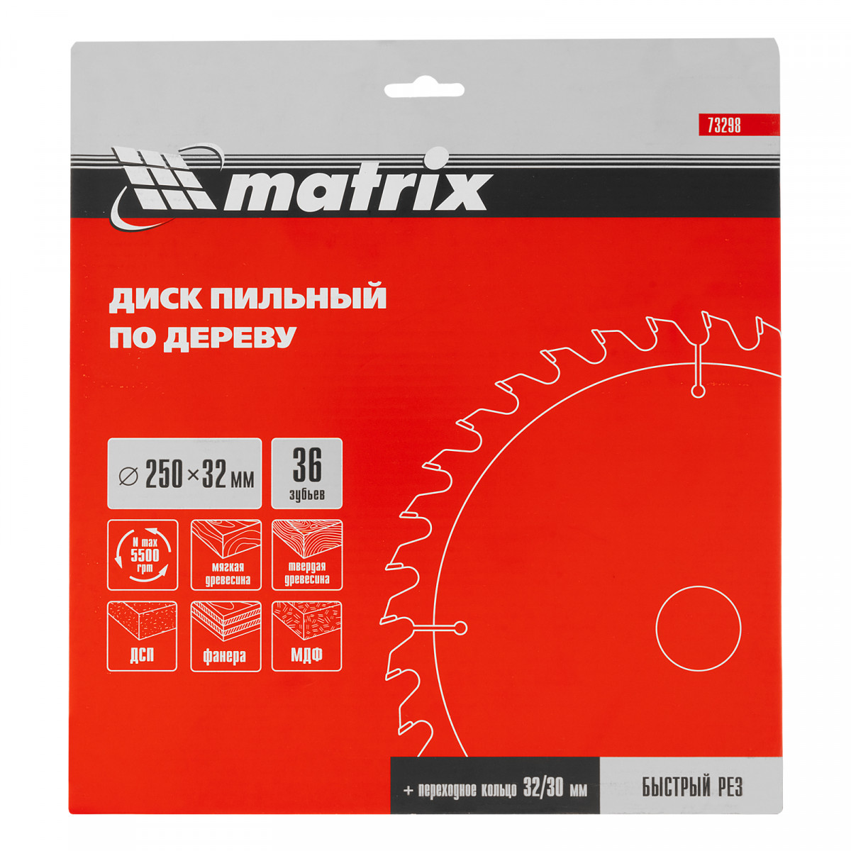 Пильный диск по дереву Matrix 73298 диаметром 250 х 32 мм, с 36 зубьями и переходным кольцом 32/30, — оснастка для циркулярных и торцовочных пил с соответствующим посадочным и внешним диаметром. Используется для продольного/поперечного реза материалов из мягкой и твердой древесины, ДСП, ДВП, фанеры, столярных плит. В комплект поставки входит переходное кольцо 32/30, позволяющее самостоятельно изменить посадочный диаметр при необходимости. Диск подходит для бытового и профессионального применения.