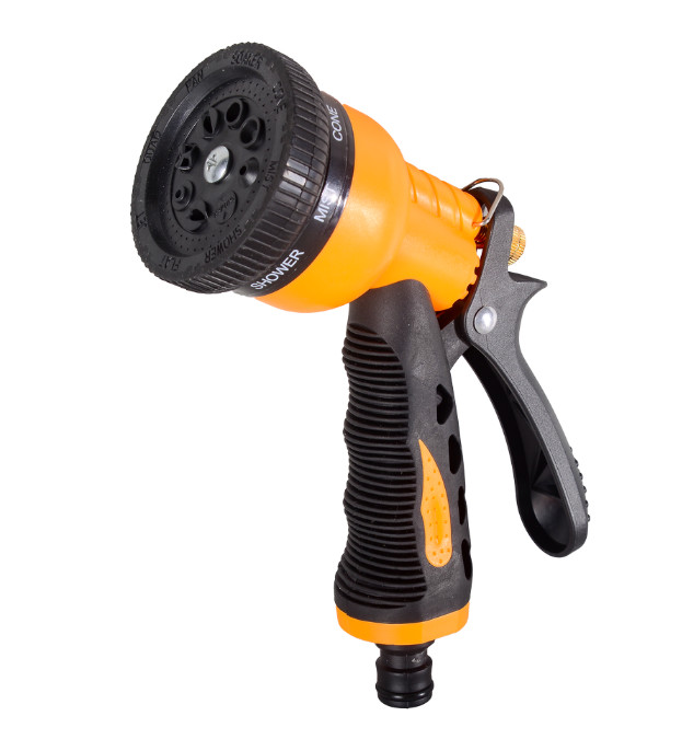 Оснащен регулировкой интенсивности распыления в 8 режимах от слабой до жесткой струи для эффективного полива участка.