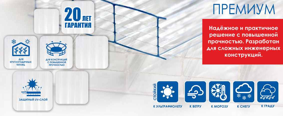 • Защита от ультрафиолетового излучения (специальный защитный слой, нанесенный на наружную поверхность листов, препятствует проникновению наиболее вредных для внутреннего помещения УФ излучений).