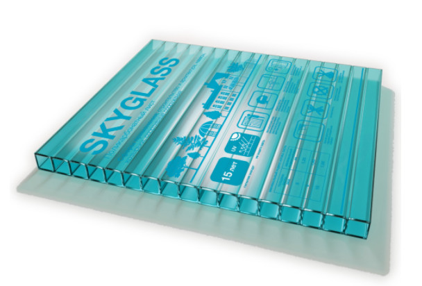 Сотовый поликарбонат SKYGLASS — представляет марку, отличающуюся оптимальным соотношением цены и качества, с защитой от UV-излучения 30 мкм. Кроме того, стоит отметить дополнительные преимущества сотового поликарбоната SKYGLASS, которые гарантируют длительный срок службы в любых сферах его применения: - отлично пропускает световые лучи и рассеивает их; - обладает шумо- и теплоизоляцией; - пластичен; - обладает повышенной ударопрочностью; - долговечен; - легкий – в 16 раз легче стекла, однако обладает такими же светопропускными свойствами; - при повреждении не образует осколков; - вязкая структура позволяет легко изгибаться даже в холодном состоянии; - легко монтируется с помощью специальных профилей из поликарбоната или алюминия.