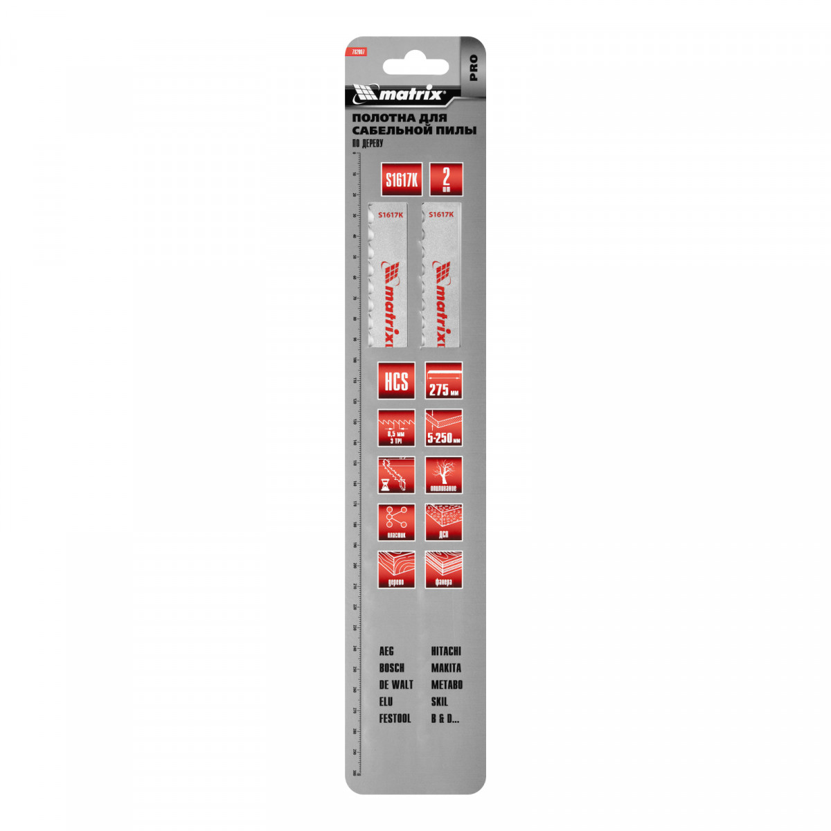 Полотна по дереву Matrix S1617K PRO 782007 с рабочей длиной 275 мм и шагом зубьев 8,5 мм, из стали HCS, 2 шт. в упаковке, — оснастка для сабельной пилы. Применяются для работ по дереву, фанере, ДВП, ДСП, пластику. Толщина пропила составляет от 5 до 250 мм. Полотна позволяют производить прямой быстрый рез. Универсальные хвостовики совместимы с сабельными электропилами ведущих производителей. Изделия будут полезны во время строительства, ремонта, а также пригодятся для работы на дачном участке.