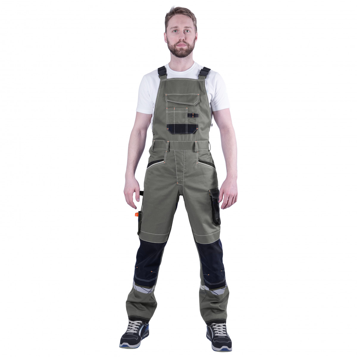• с отрезным нагрудником, с вместительным накладным карманом с клапаном на ленте-контакт
