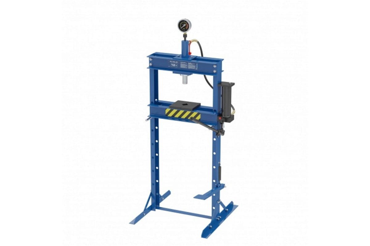 Гидравлический пресс с манометром и педалью поставляется комплектом из 2 частей и способен воздействовать на предметы с усилием до 12 т.
