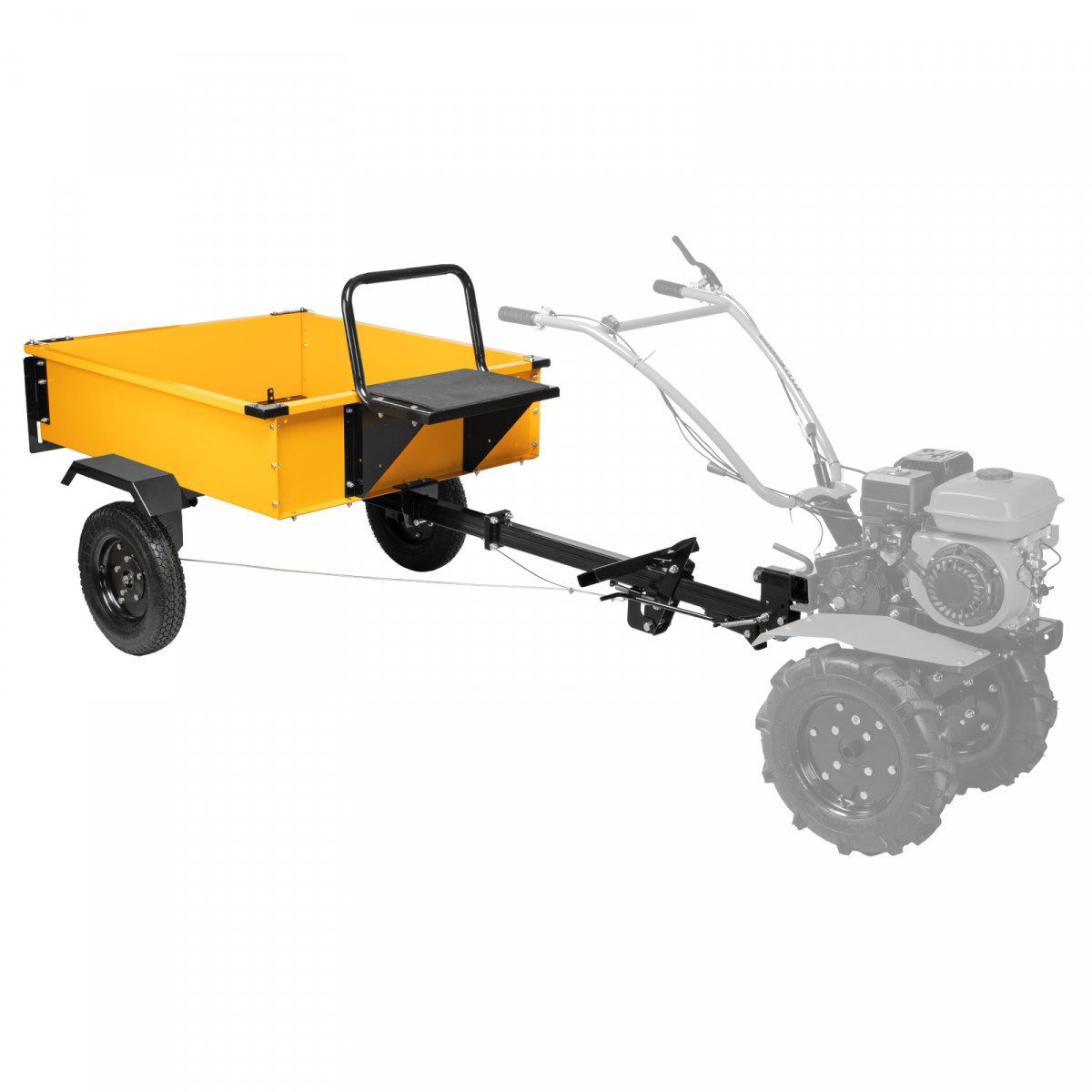 • Совместимость со всеми мотоблоками — прицеп поставляется с универсальной регулируемой сцепкой.