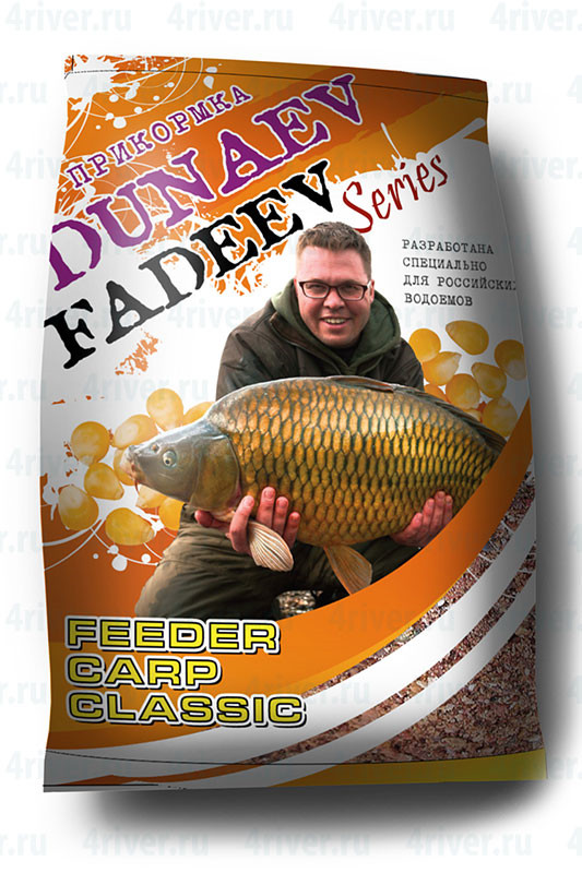 Dunaev-Fadeev Feeder Carp Classic – классическая прикормочная смесь светлого цвета для ловли карпа фидерными снастями. Особенность данной серии заключается в том, что в составе используется четыре разных вида кукурузных частиц, отличающихся по размеру и химической составляющей. Прикормка достаточно калорийная, поэтому для того, чтобы рыба как можно дольше оставалась на точке и не переедала, в нее был добавлен специальный аминокомплекс, который стимулирует пищеварение у рыб. Применять данную смесь можно как на коммерческих, так и на диких водоемах.