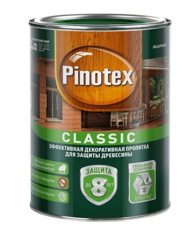 Пропитка cодержит активные добавки против плесени и синевы. Окрашенная поверхность устойчива к воздействию солнца, дождя, снега и мороза. Pinotex Classic легко наносится и быстро впитывается в поверхность древесины, образуя полуматовое покрытие. Подчеркивает естественную текстуру древесины. Для усиленной защиты глубоких слоев древесины от биокоррозии рекомендуется применять пропитку в системе с грунтовкой  Pinotex Base. Возможно применение для защиты бревенчатых строений и полукруглых облицовочных профилей.