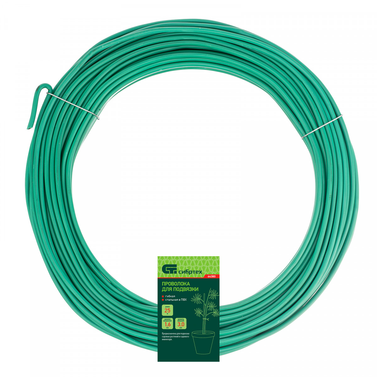 Проволока для подвязки, стальная в ПВХ (зеленый) 25 м, внутр. 1.6 мм / внеш. 3 мм Сибртех