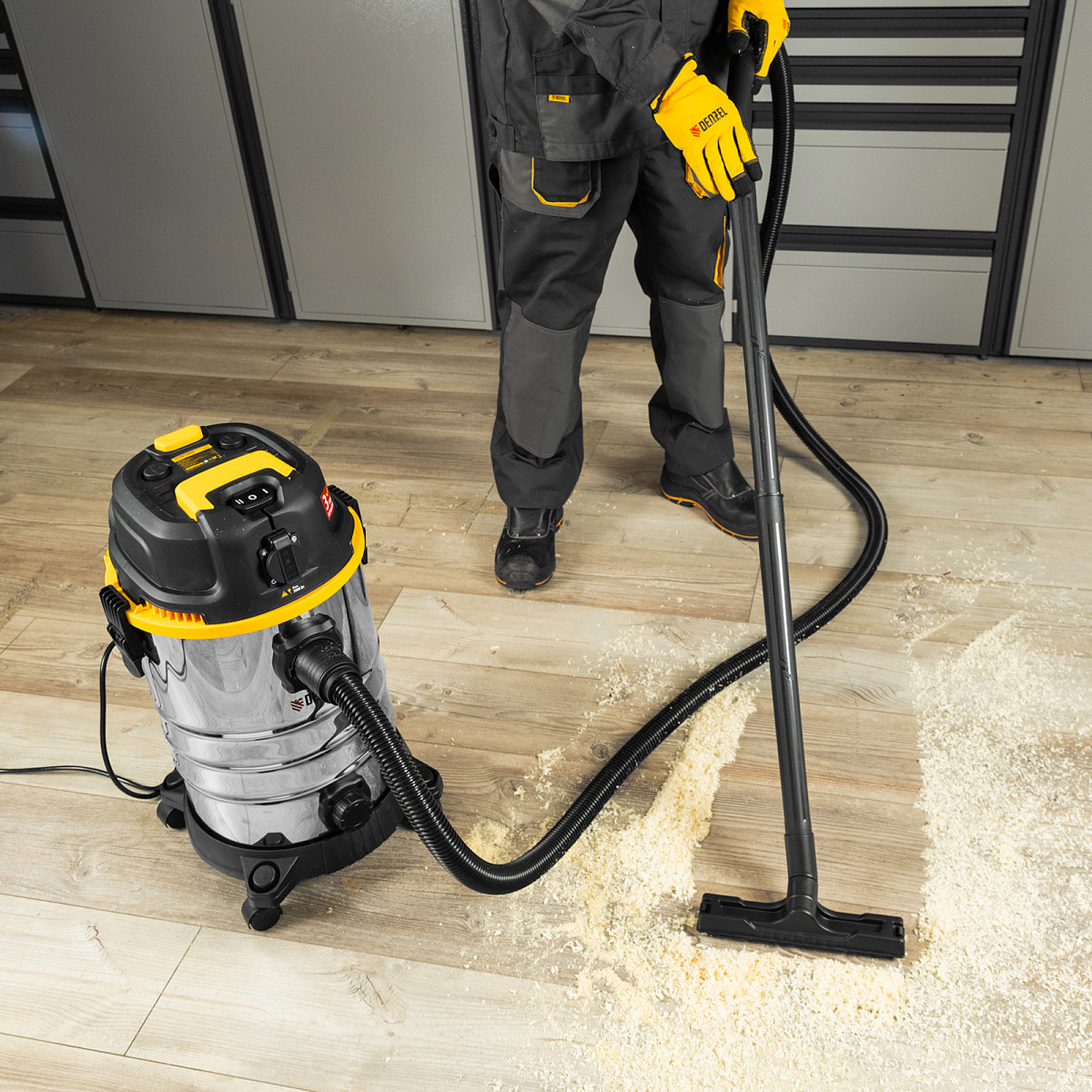 Пылесос строительный Denzel RVC30 28203 мощностью 1400 Вт, с баком объемом 30 л и шлангом длиной 3 м, оснащен розеткой с автосинхронизацией и предназначен для уборки бетонной, кирпичной пыли, опилок, стружки, также предусмотрена функция сбора воды. К пылесосу можно подключить электроинструмент, чтобы минимизировать количество пыли, образующейся в результате пиления, сверления, фрезерования. Техника используется во время проведения строительных и ремонтных работ, будет полезна для поддержания чистоты в мастерской, гараже, производственном помещении.