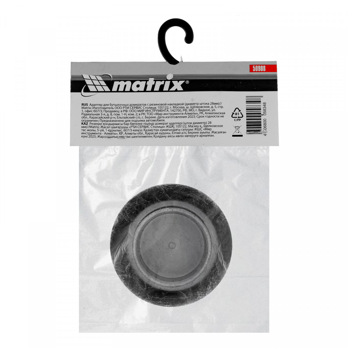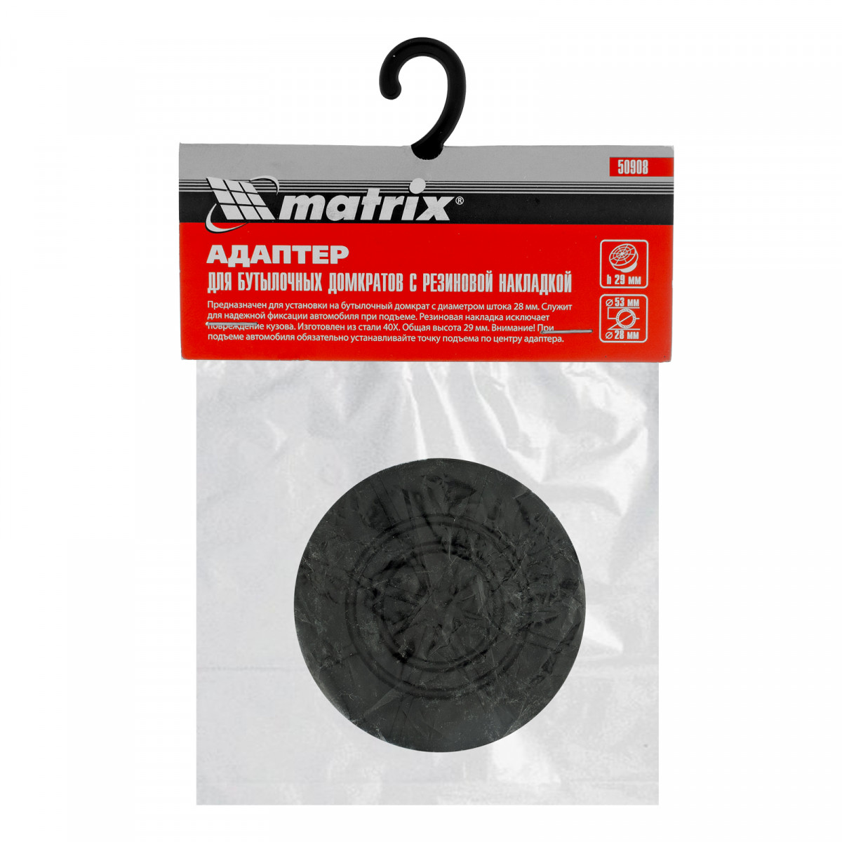 Адаптер для бутылочных домкратов Matrix 50908 с резиновой накладкой устанавливается на шток диаметром 28 мм и защищает кузов автомобиля во время его подъема. Уверенно выдерживает нагрузку в 4 тонны. Опора совместима с домкратами Sparta 50323, 50333, 50342, Matrix 50717, 50752, 50754, Stels 51102, 51145, 51162.