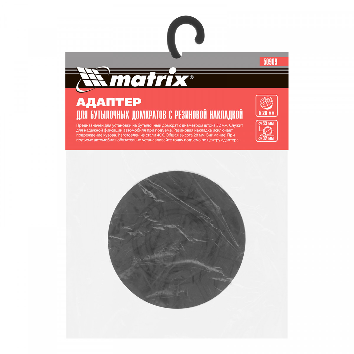 Адаптер для бутылочных домкратов Matrix 50909 с резиновой накладкой устанавливается на шток диаметром 32 мм и защищает кузов автомобиля во время его подъема. Уверенно выдерживает нагрузку в 6 тонн. Опора совместима с домкратами Sparta 50343, Matrix 50721, 50756, Stels 51097, 51103, 51115, 51116, 51117, 51140, 51163, 51164, 51166.