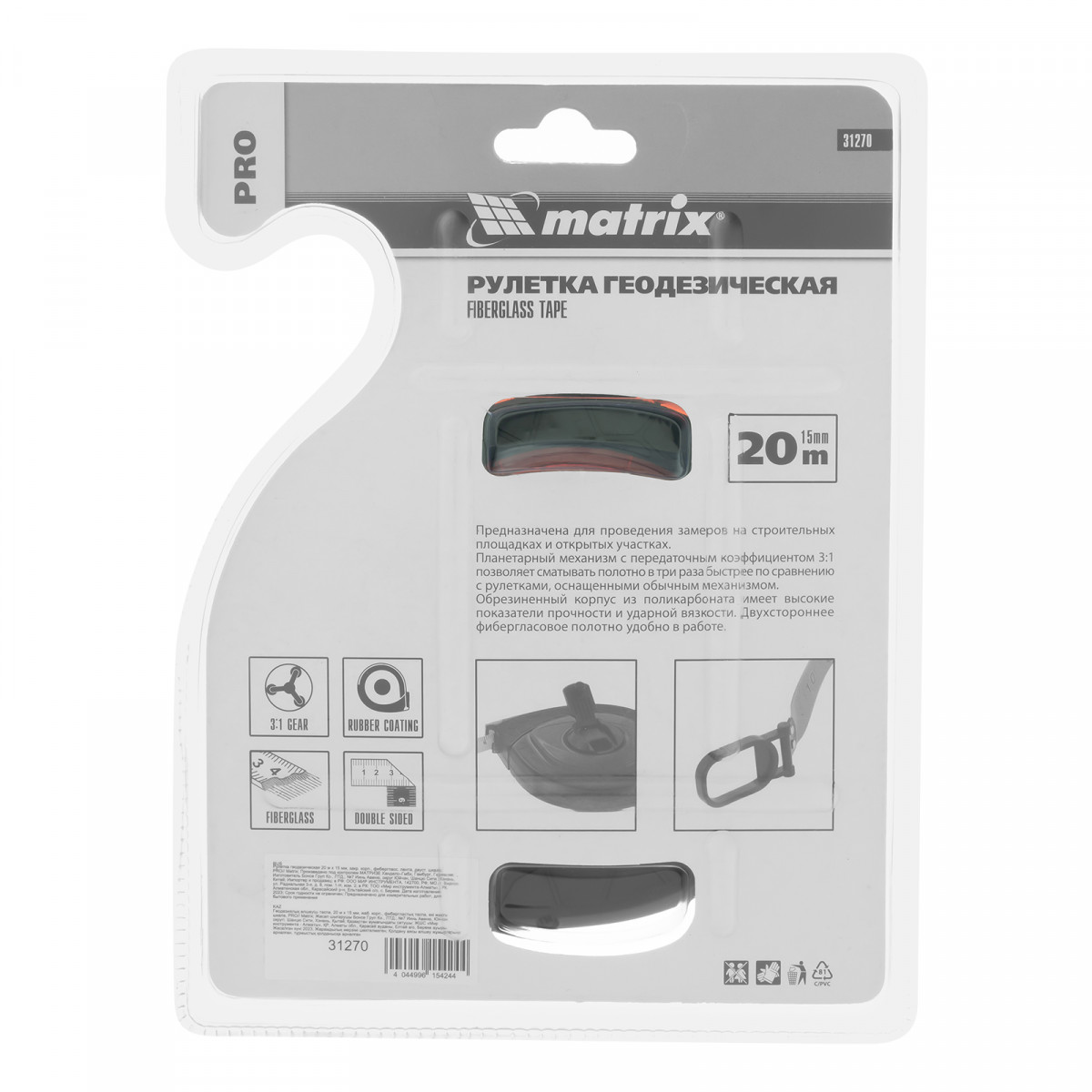 Геодезическая рулетка Matrix PRO 31270 в закрытом корпусе, 20 м х 15 мм, с фибергласовой лентой и двусторонней шкалой, используется при проведении замеров на открытых участках и строительных объектах. Будет полезна во время картографических исследований и работ по созданию ландшафтного дизайна. Двухкомпонентный корпус из поликарбоната с резиновыми вставками устойчив к повреждениям и не боится ударов и падений. Кольцо-зацеп фиксируется на поверхности, избавляя от необходимости придерживать конец ленты рукой.