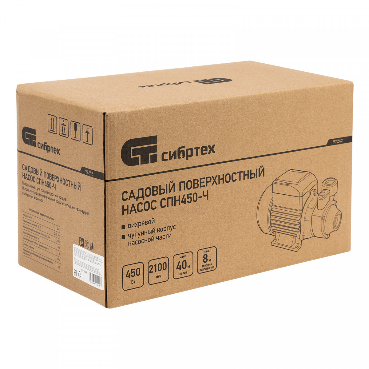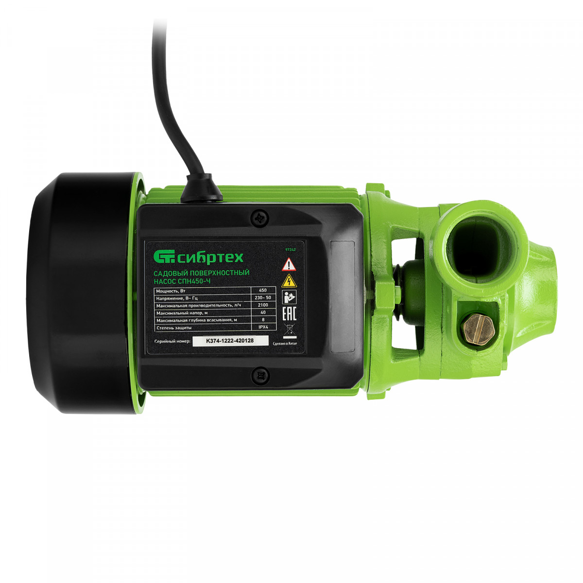 Садовый поверхностный насос СПН450-Ч, 450 Вт, напор 40 м, 2100 л/ч, чугун Сибртех