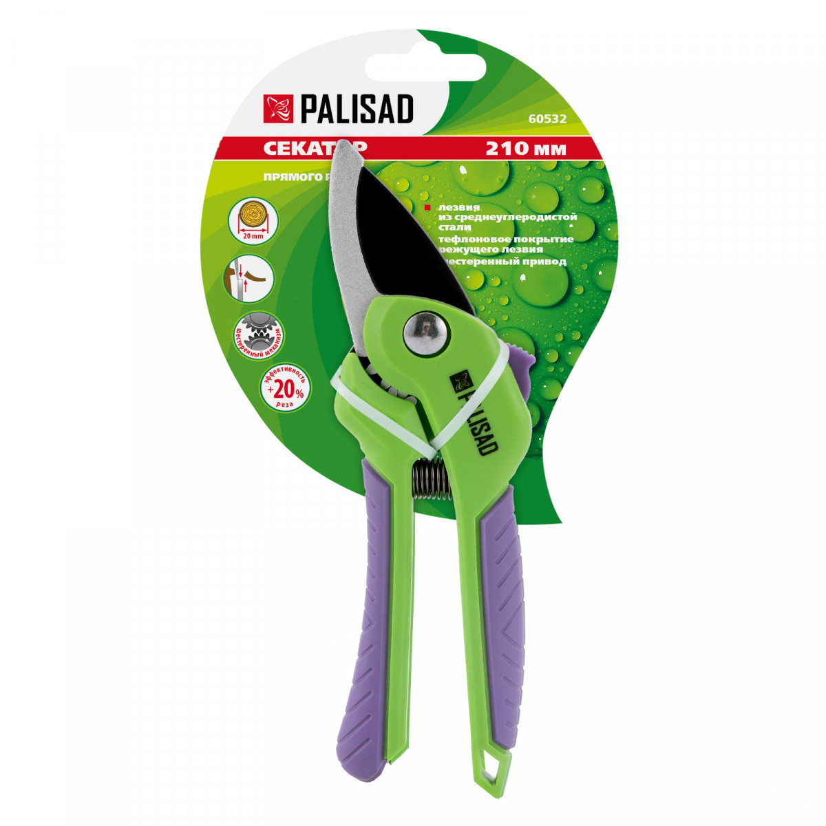 Секатор прямого реза Palisad 60532 длиной 210 мм, с шестеренным приводом и двухкомпонентными рукоятками, используется для щадящей обрезки живых веток толщиной до 20 мм. Режущее лезвие с тефлоновым покрытием легко справляется с этой задачей. Лезвия перемещаются в параллельных плоскостях, поэтому секатор производит чистый и ровный срез, минимально повреждая растение. Шестеренный привод увеличивает силу сжатия на 15%.