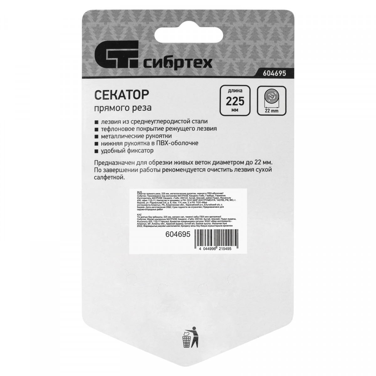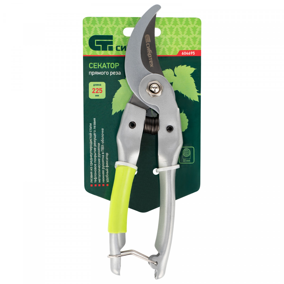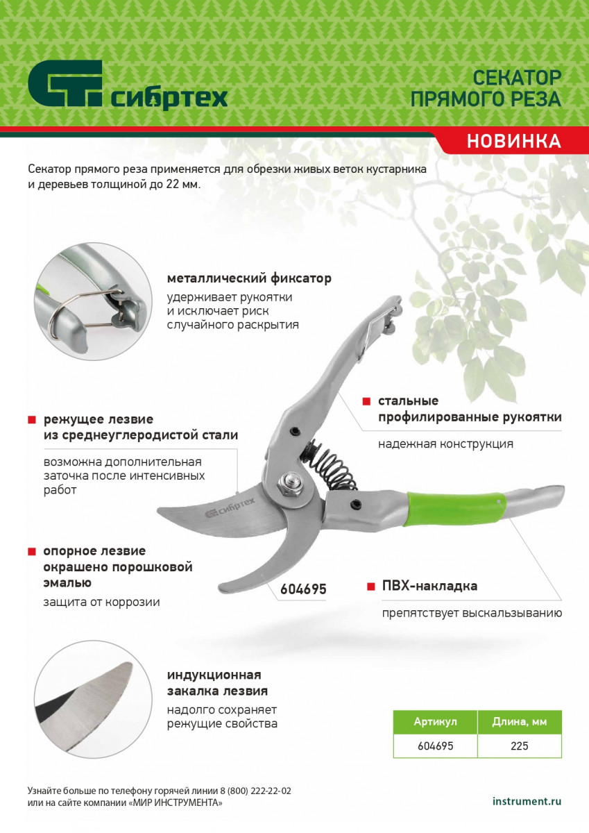 Секатор прямого реза Сибртех 604695 длиной 225 мм, с металлическими рукоятками (нижняя в ПВХ-оболочке), используется для обрезки живых веток толщиной до 22 мм. Срез получается гладким и аккуратным, поскольку лезвия перемещаются в параллельных плоскостях. Растению причиняется минимальный ущерб. Плотность примыкания лезвий можно регулировать при помощи винта. Секатор пригодится для ухода за растительностью на даче и в саду.