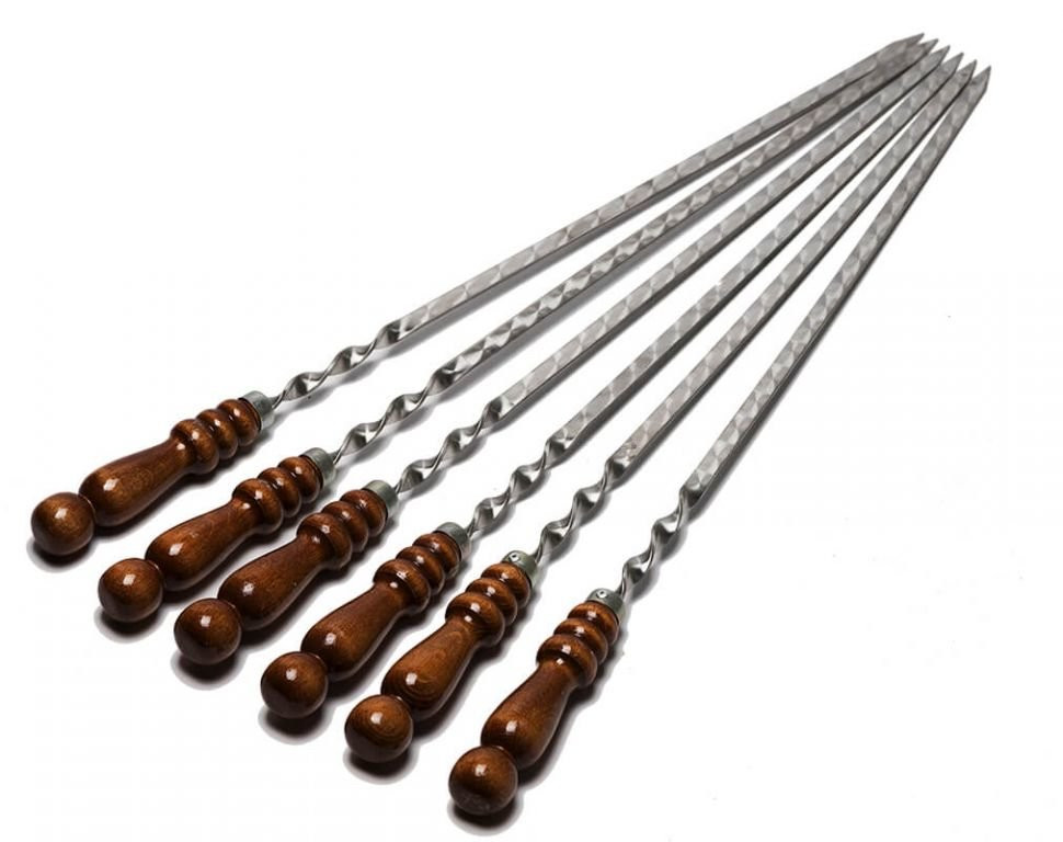 Шампура из нержавеющей стали и деревянной ручкой из бука, ручка покрашена морилкой и покрыта несколькими слоями качественного, огнестойкого лака.