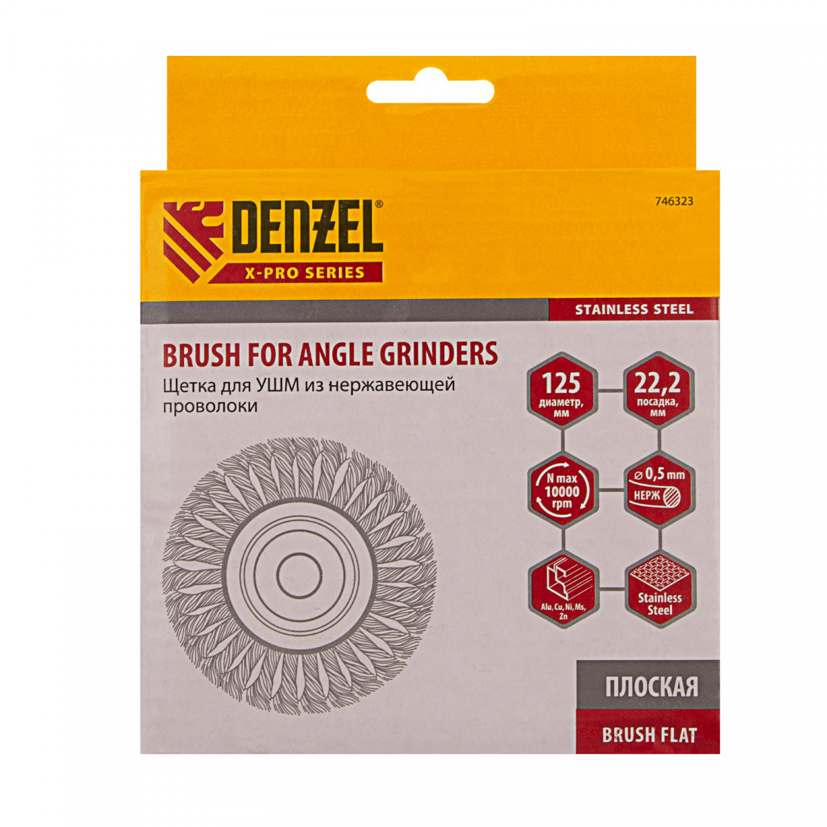 Щетка для УШМ, 125 мм, "Плоская", крученая нержавеющая проволока 0.5 мм, посадка 22.2 мм Denzel