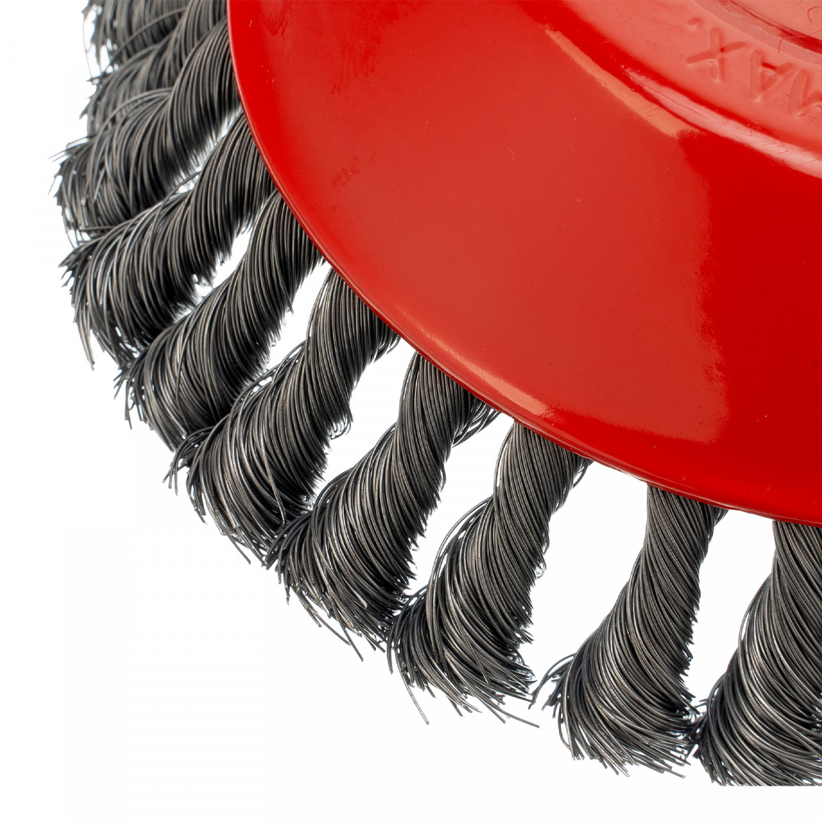 Щетка Matrix «Чашка» 74618 диаметром 150 мм, с присоединительной резьбой М14, с щетиной из крученой проволоки диаметром 0,35 мм, устанавливается на УШМ, поддерживающую работу со скоростью 4500 об/мин. Щетина предназначена для грубой (черновой) обработки поверхностей, менее агрессивной по сравнению с щетиной 0,5 мм. Изделие подходит для удаления загрязнений, снятия толстого слоя ржавчины, ЛКМ, зачистки сварных швов.