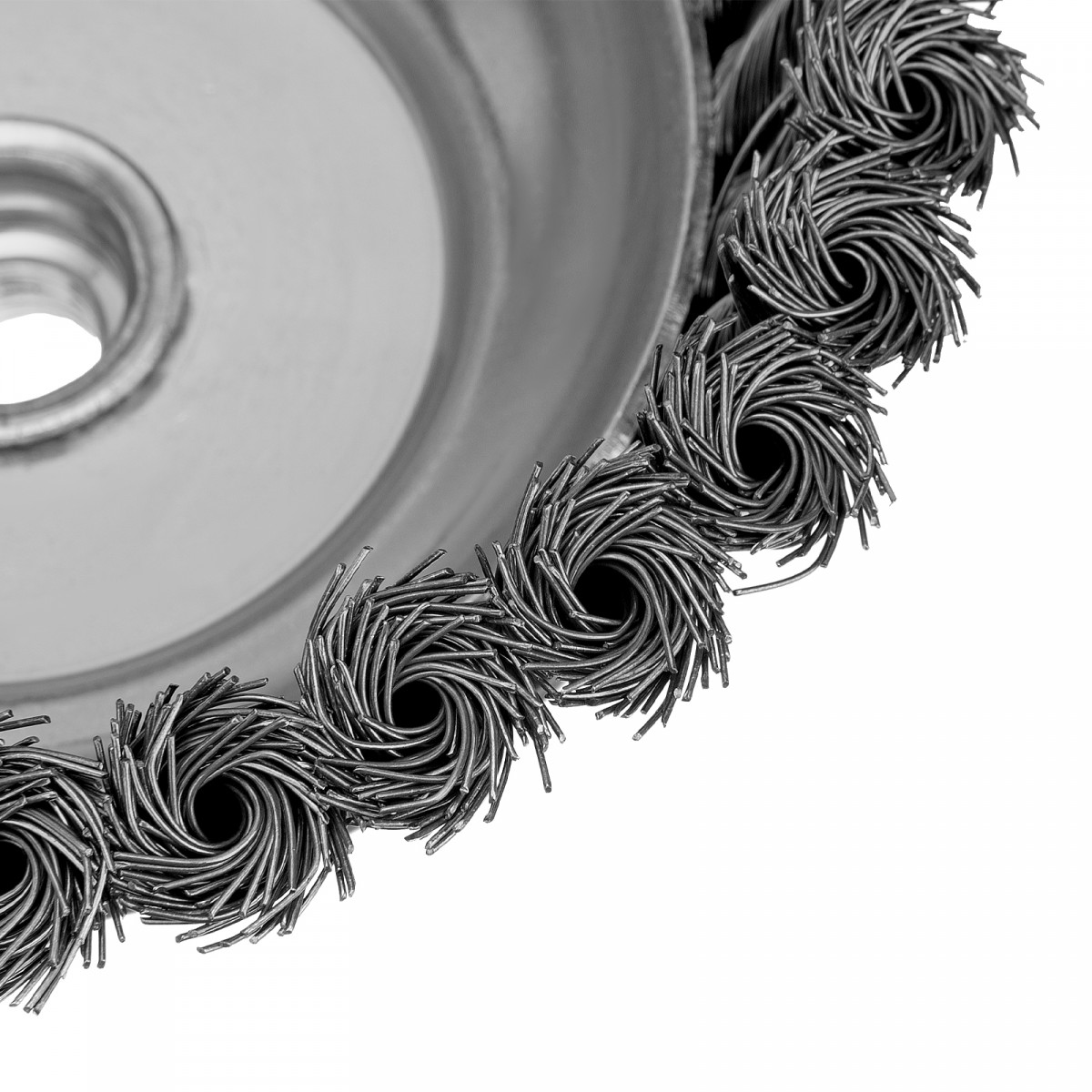 Щетка Matrix «Чашка» 74629 диаметром 150 мм, с присоединительной резьбой М14, с щетиной из крученой проволоки диаметром 0,5 мм, устанавливается на УШМ, поддерживающую работу со скоростью 4500 об/мин. Изделие предназначено для грубой (черновой) обработки поверхностей и подходит для удаления загрязнений, снятия толстого слоя ржавчины, ЛКМ, зачистки сварных швов.
