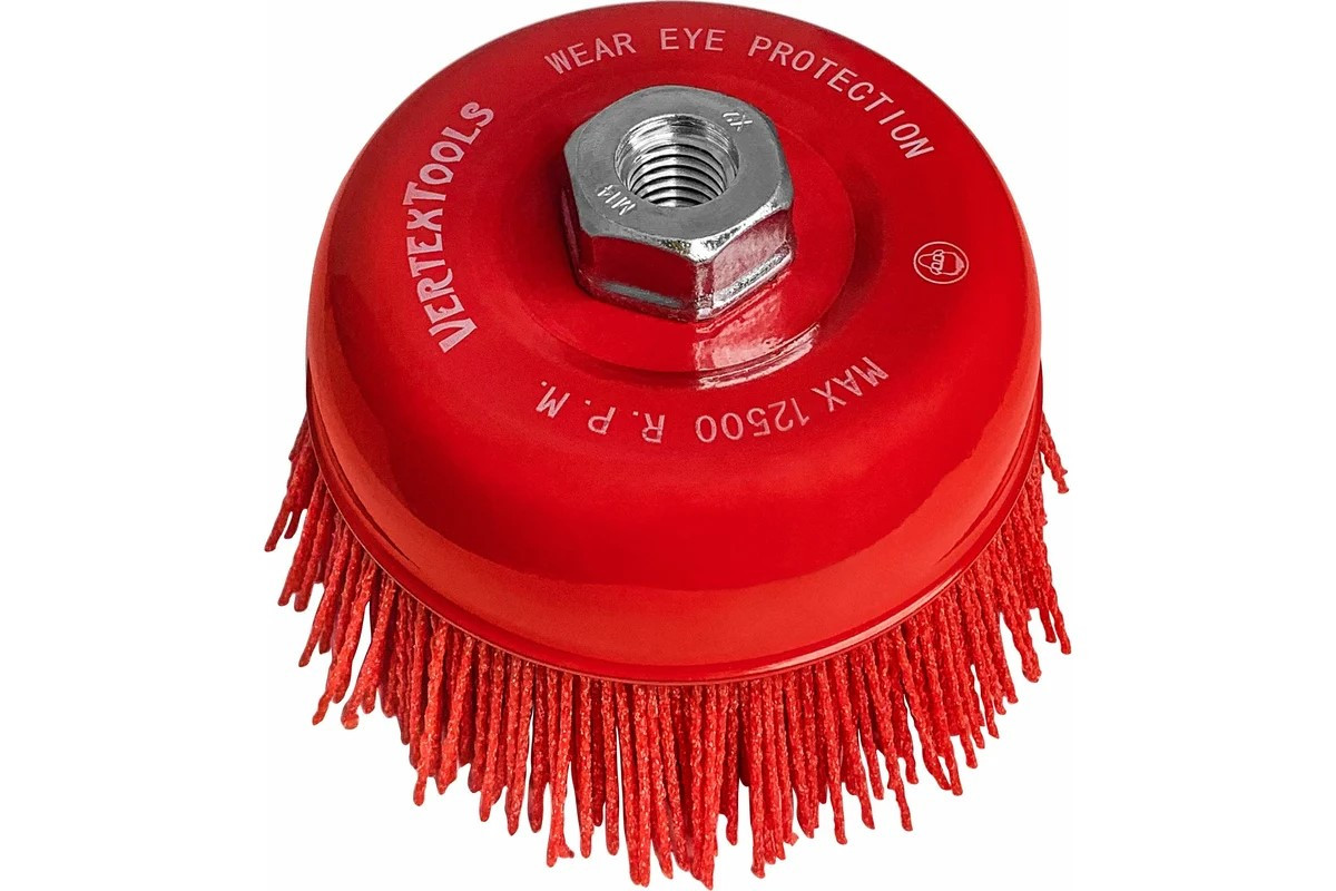 Щетка нейлоновая чашка для УШМ, 75 мм, М14 vertextools 12400-75 предназначена для удаления заусенцев, въевшейся грязи и шлифовки поверхностей изделий из пластика, древесины, стали и цветных металлов.