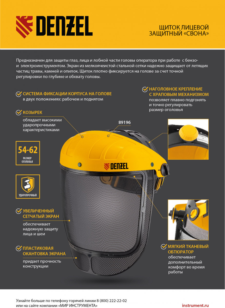 Лицевой щиток Denzel «СВОНА» НС-01 «ЛЮКС» 89196 с храповиком для плавной регулировки предназначен для защиты глаз, лица и лобной части головы пользователя во время работы с бензиновым и электрическим инструментом. Экран из мелкоячеистой стальной сетки надежно защищает пользователя от летящих частиц травы, камней, опилок и т.д. Щиток является улучшенной версией модели Denzel 89197.