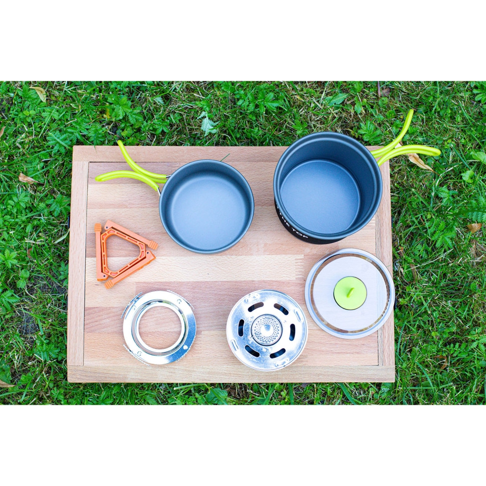 Система приготовления пищи, которая будет кстати в походах, кемпинге и при другом активном отдыхе. Включает в себя чашу, сковороду, газовую плиту, переходник для посуды, крышку, подставку для газовых баллонов.