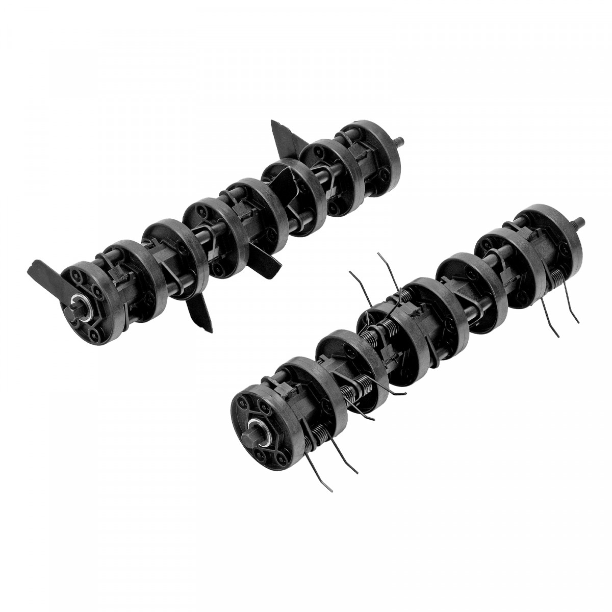 В комплект поставки включены сразу 3 насадки: 2 вала с пружинами и 1 вал с ножами. Вал с пружинами обеспечивает удаление сухой травы, мха и мелкого мусора с поверхности газона непосредственно перед аэрацией ножами, при этом не меняет структуру почвы и не причиняет вреда растениям. Вал с ножами деликатно прорезает поверхность газона, обеспечивая приток воздуха и влаги к корням растений.