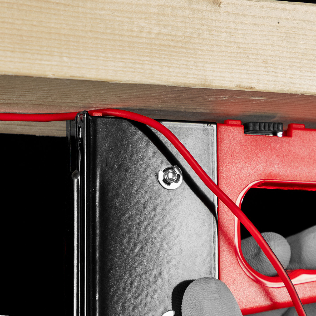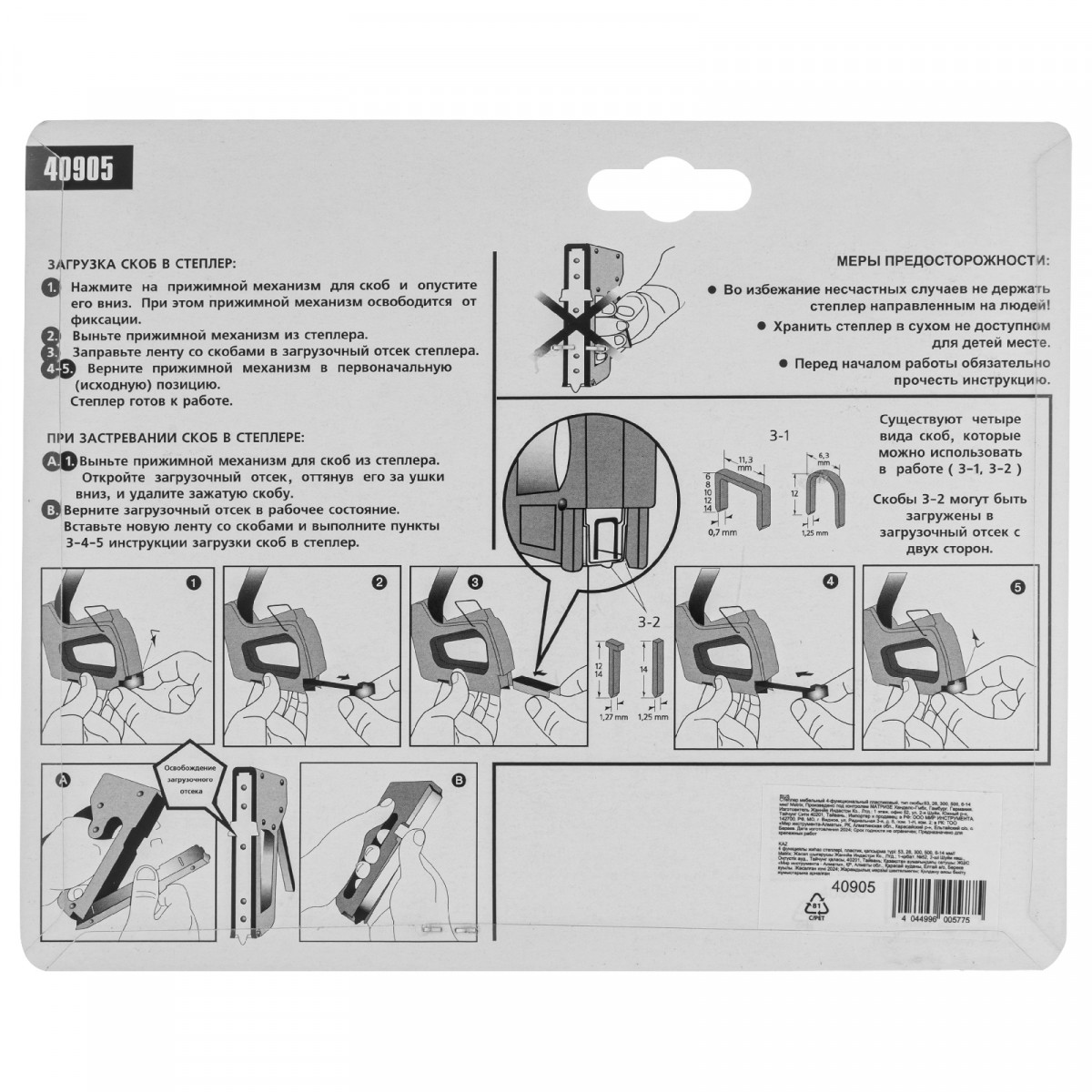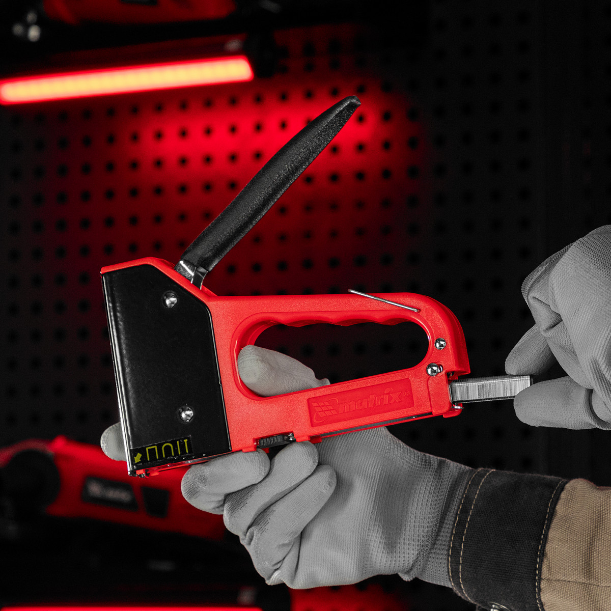 • Безопасное хранение и транспортировка — металлическая скоба фиксирует рукоятку, предотвращая случайное срабатывание степлера.