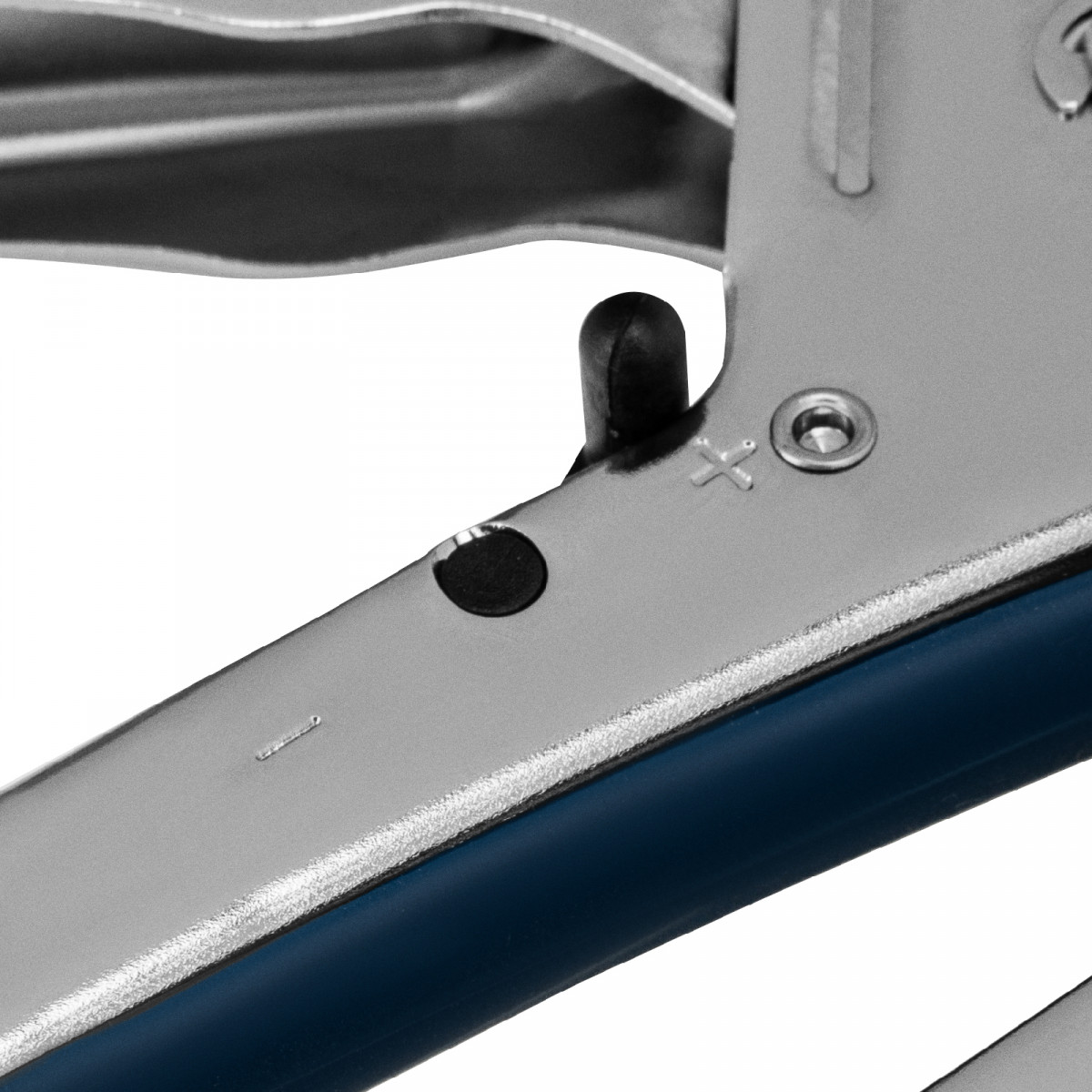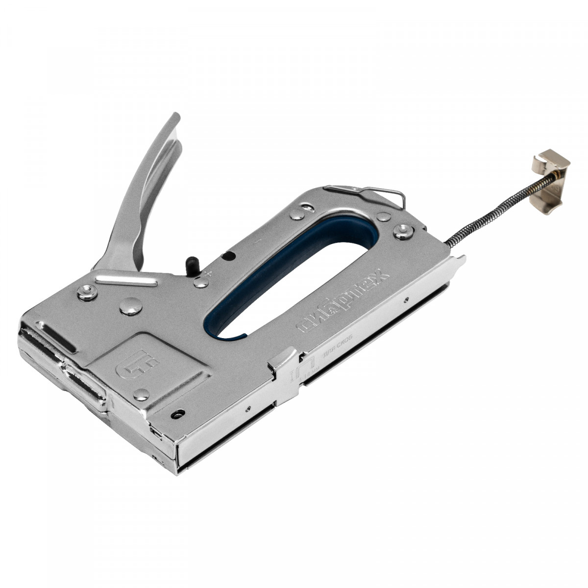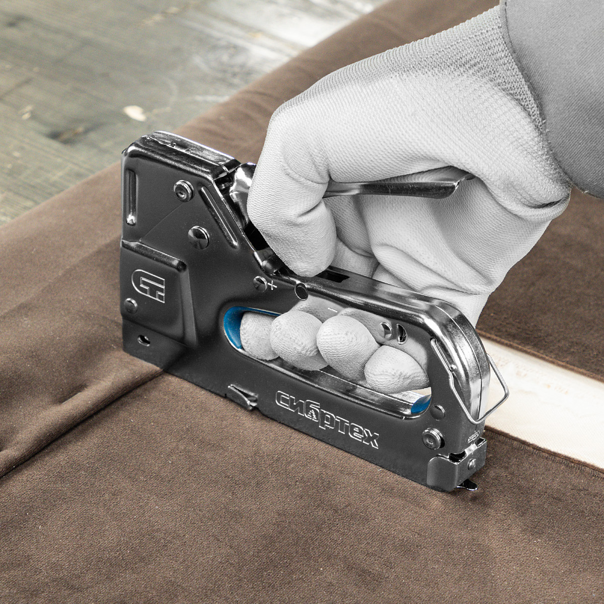 • Безопасное хранение и транспортировка — скоба-фиксатор удерживает рукоятку в нерабочем положении, исключая случайное срабатывание степлера.