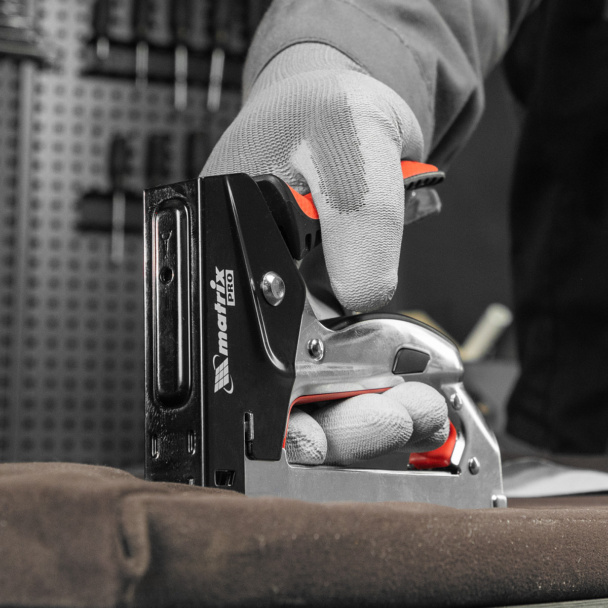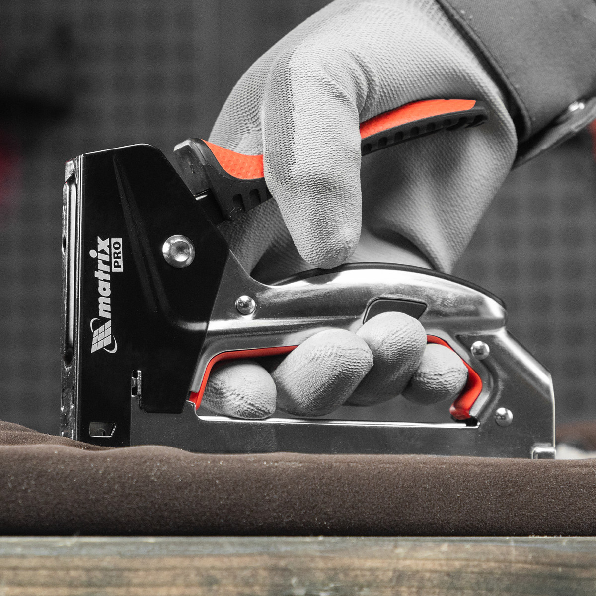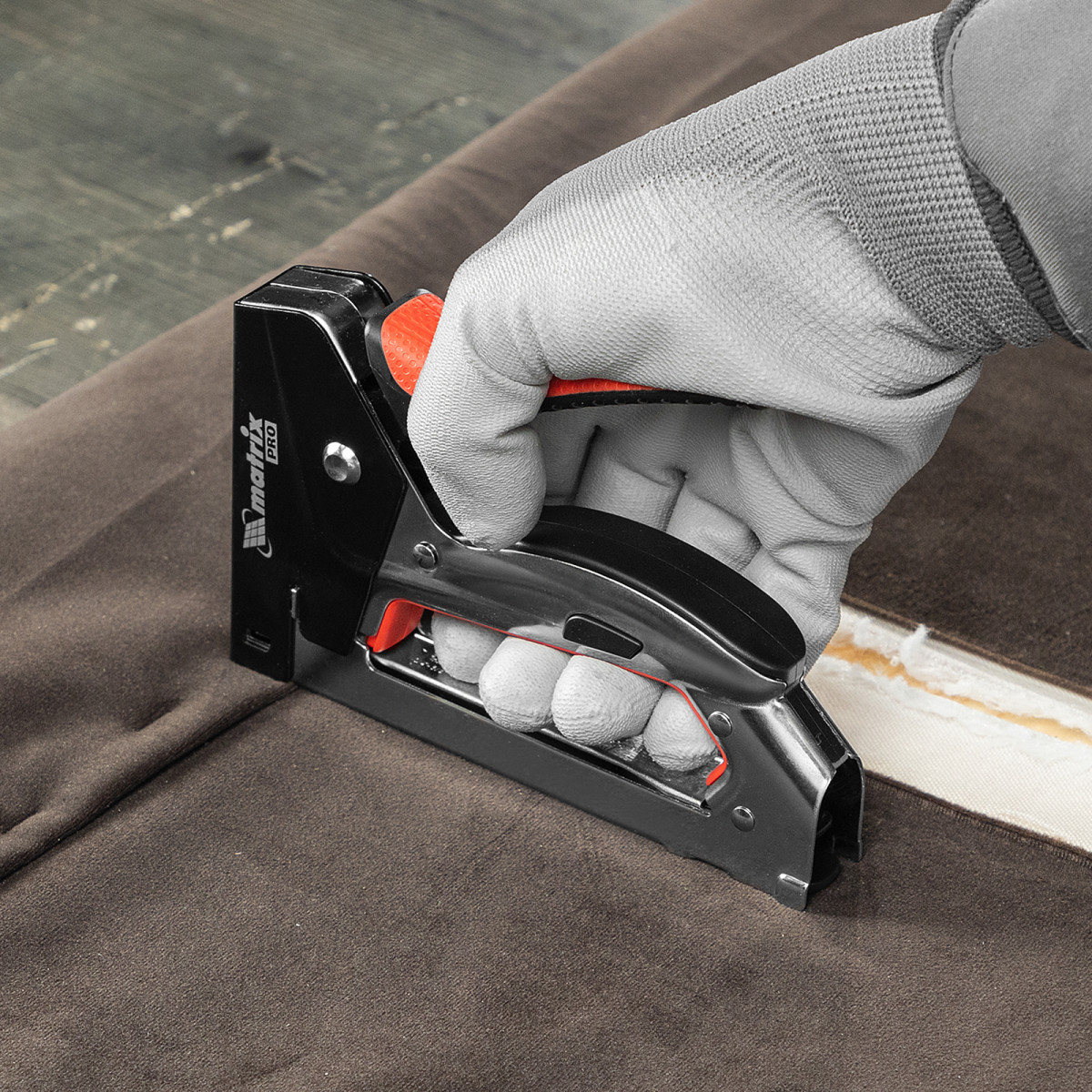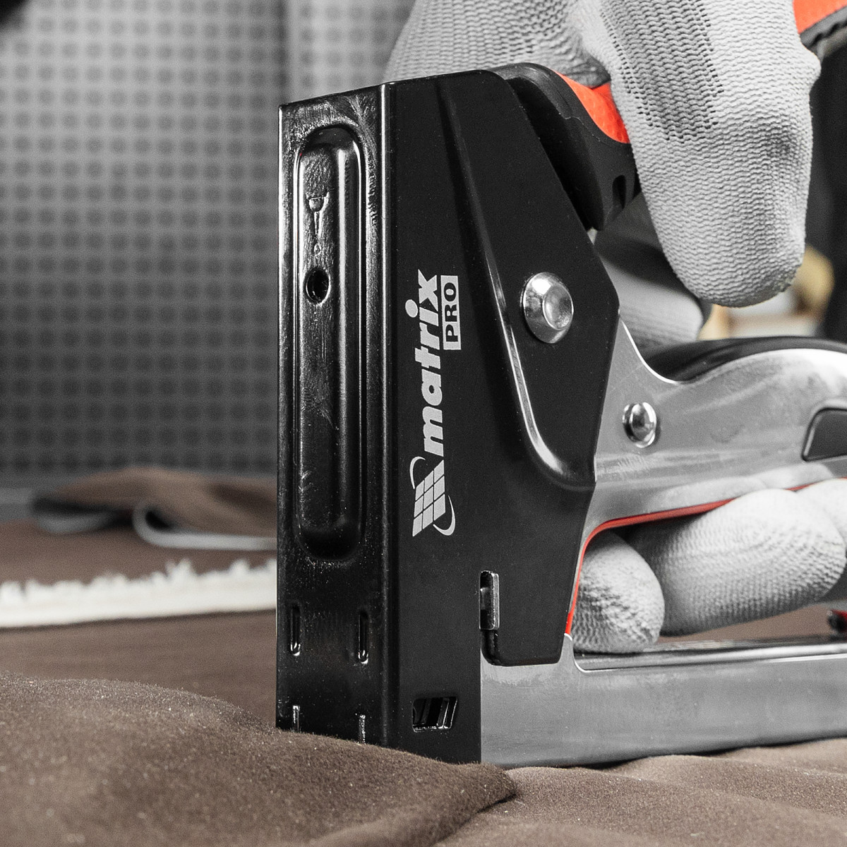 Стальной мебельный степлер Matrix PRO 40916 с механизмом быстрой загрузки скоб позволяет быстро зафиксировать на деревянном основании фанеру, оргалит, ДВП, ДСП, пленку ПВХ или изоляционный материал с помощью скоб 53 размером 6-10 мм. Инструмент используют для обивки или сборки мебели, проведения теплоизоляционных и отделочных работ, укладки ковровых покрытий.