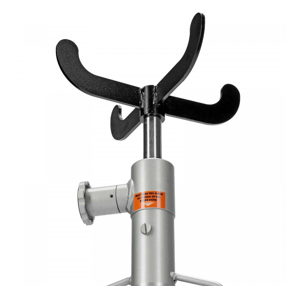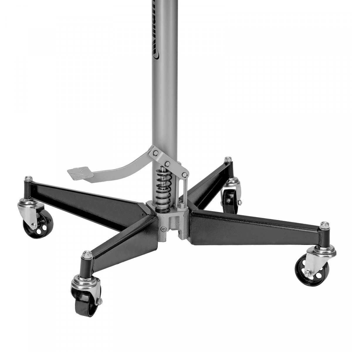 - Для удобства перемещения стойки по рабочей площадке предусмотрены колеса, а для ее надежной фиксации на месте — стопорные педали.