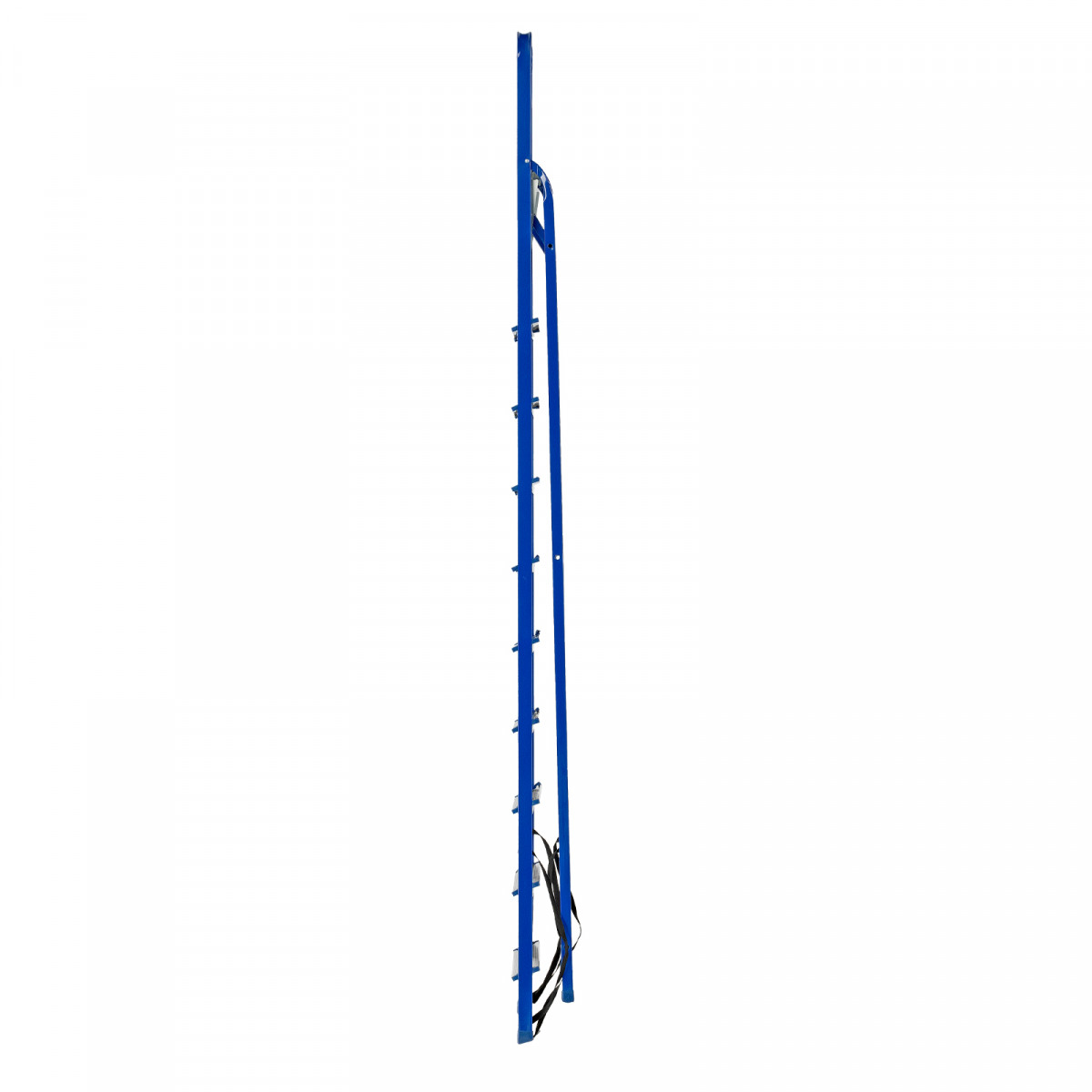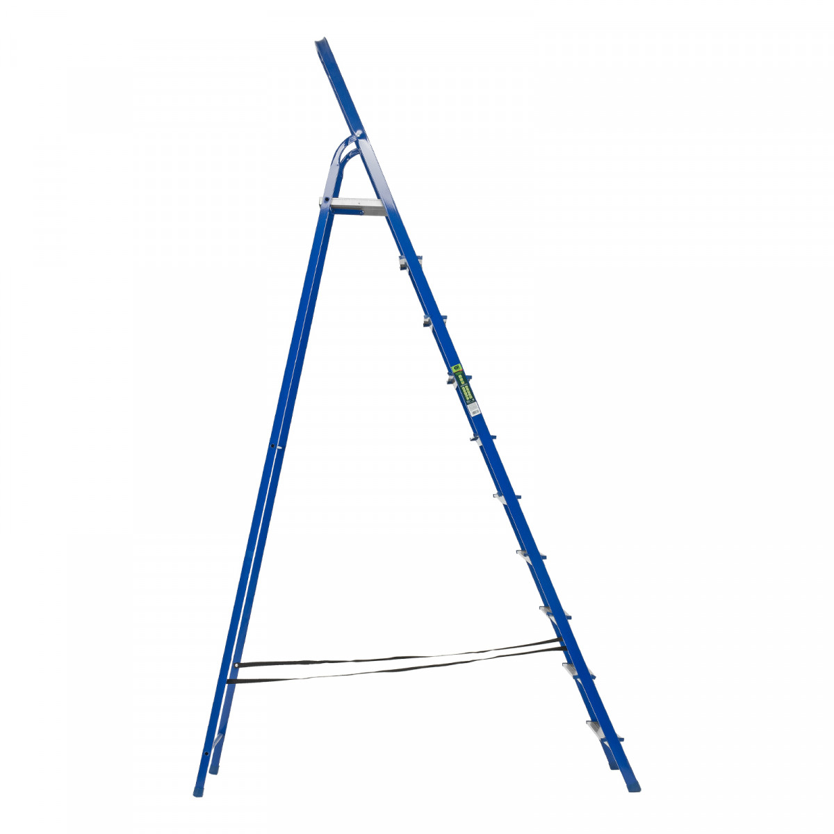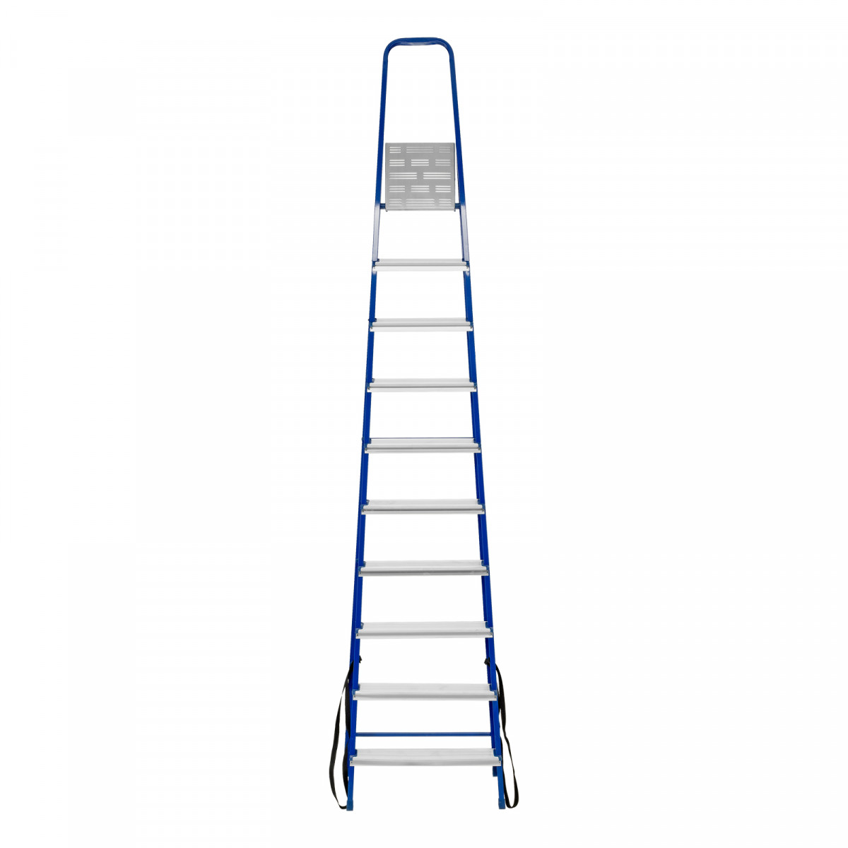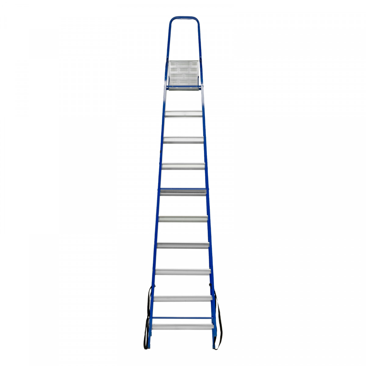 - Надежность — рама изготовлена из профилированной стали, стальная верхняя площадка с зацепами прочно фиксирует стремянку в рабочем положении, страховочные ленты придают дополнительную прочность конструкции.