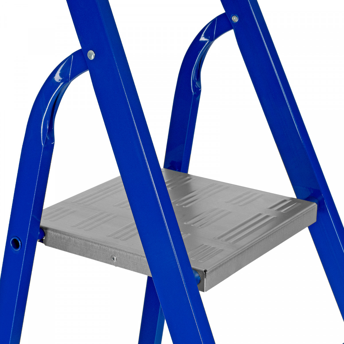 Стальная верхняя площадка с зацепами прочно фиксирует стремянку в рабочем положении.